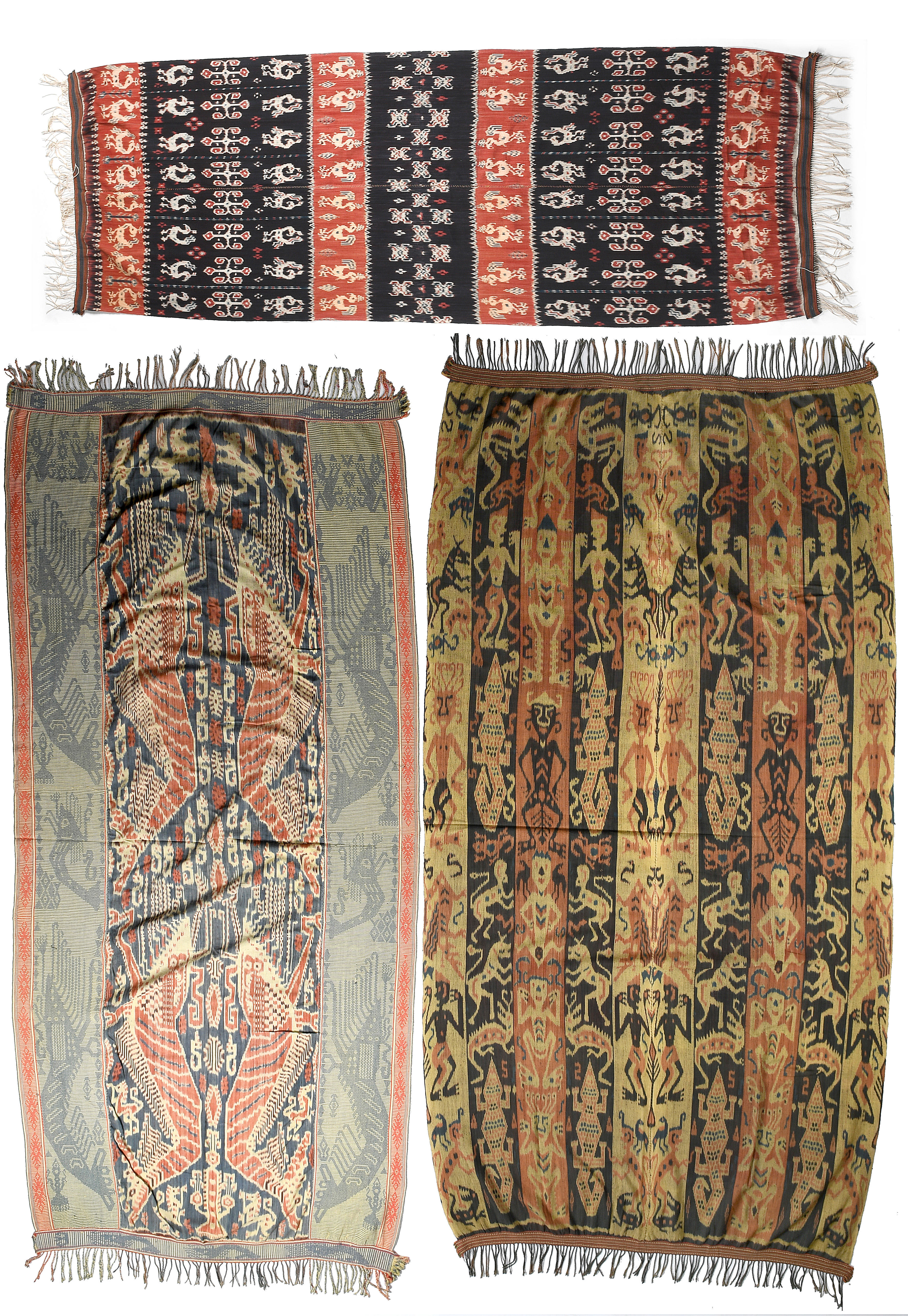each decorated with trees, birds and figures, 267cm x 121cm, 269cm x 108cm, 256cm x 78cm. (3)