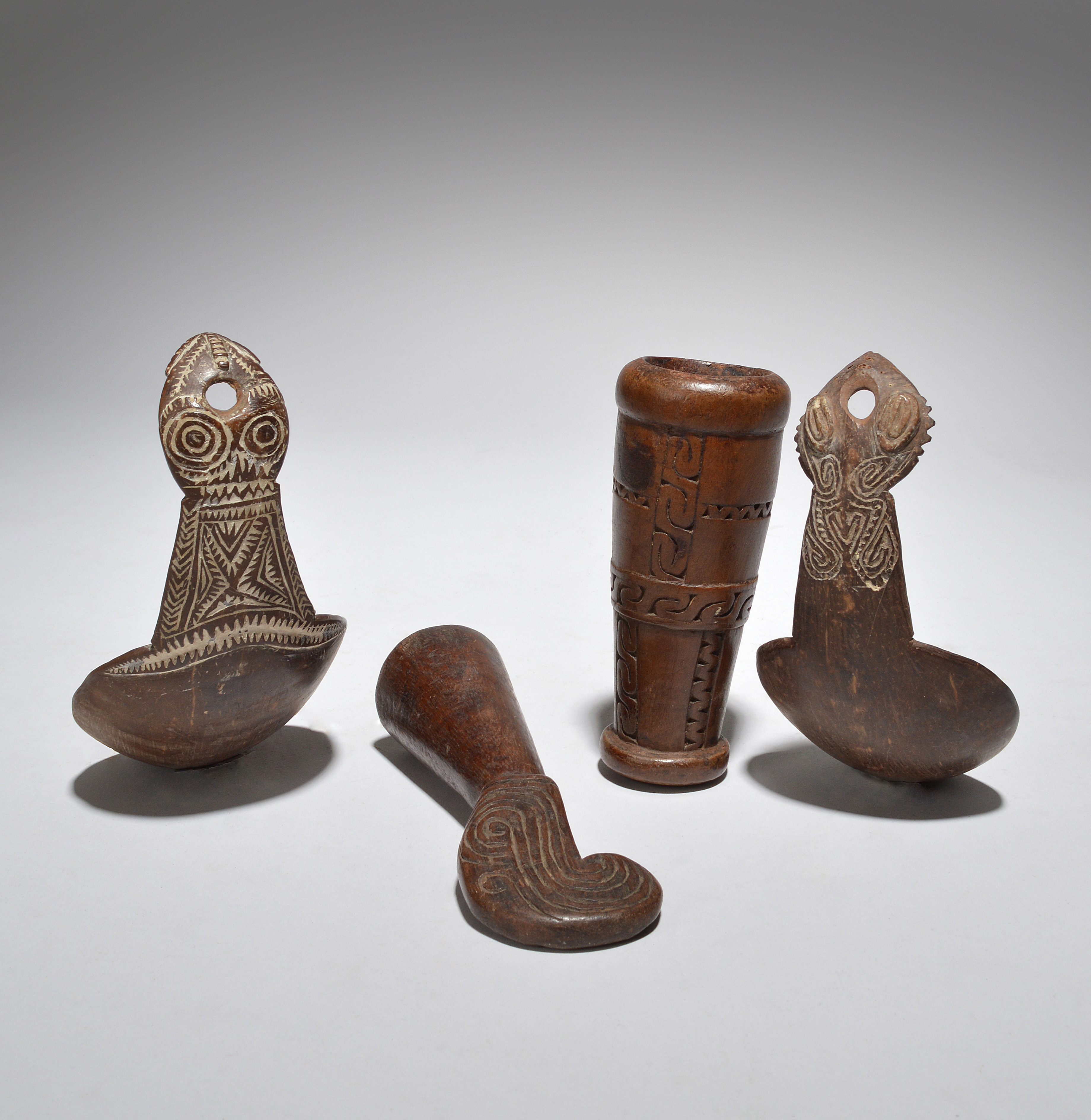 and two Papua New Guinea spoons, coconut shell with carved zoomorphic handles with lime fill, 13cm and 14.2cm long. (4)