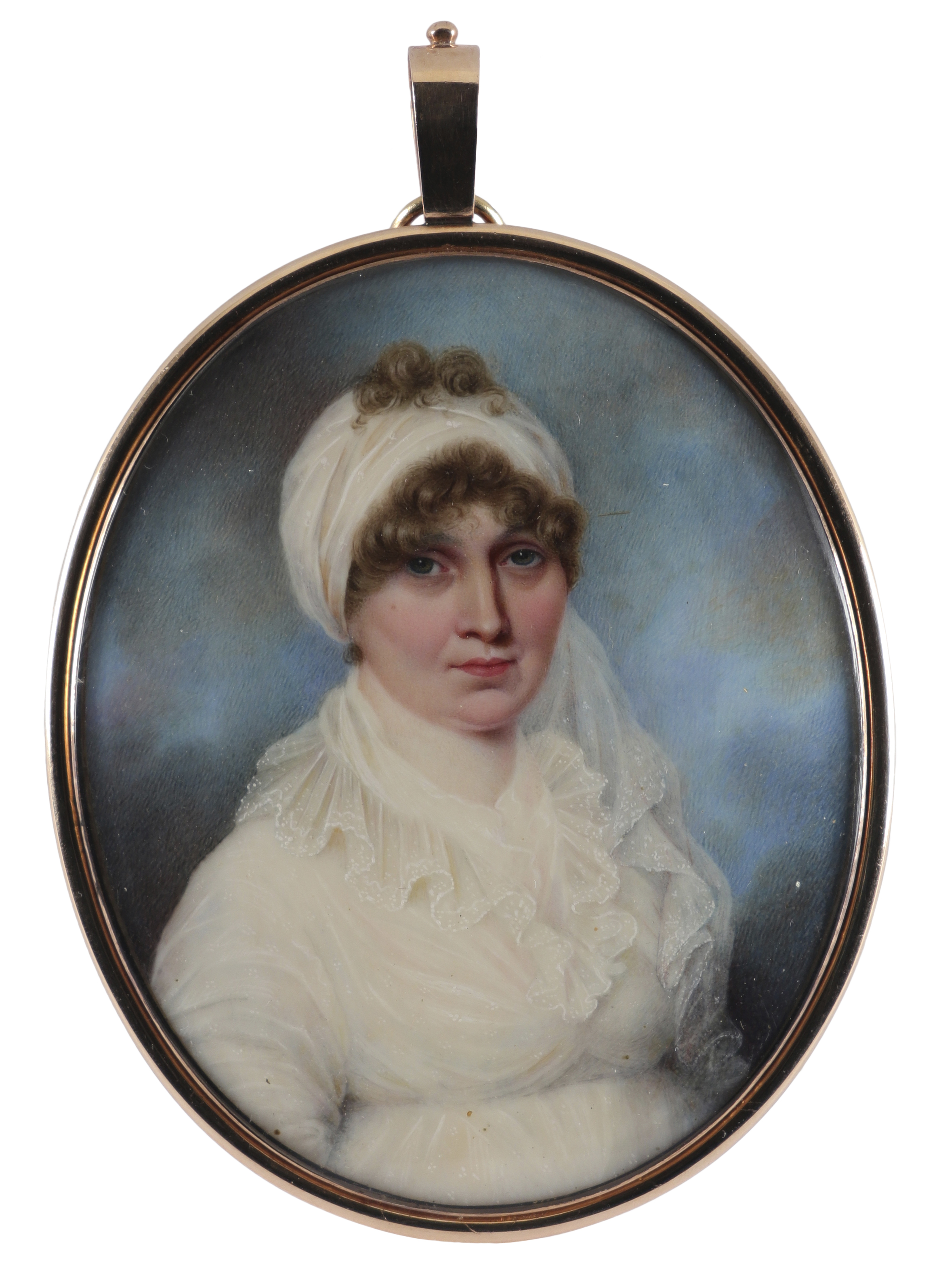 Portrait miniature of Mrs Tomas Pagan in a white dress and headscarf
