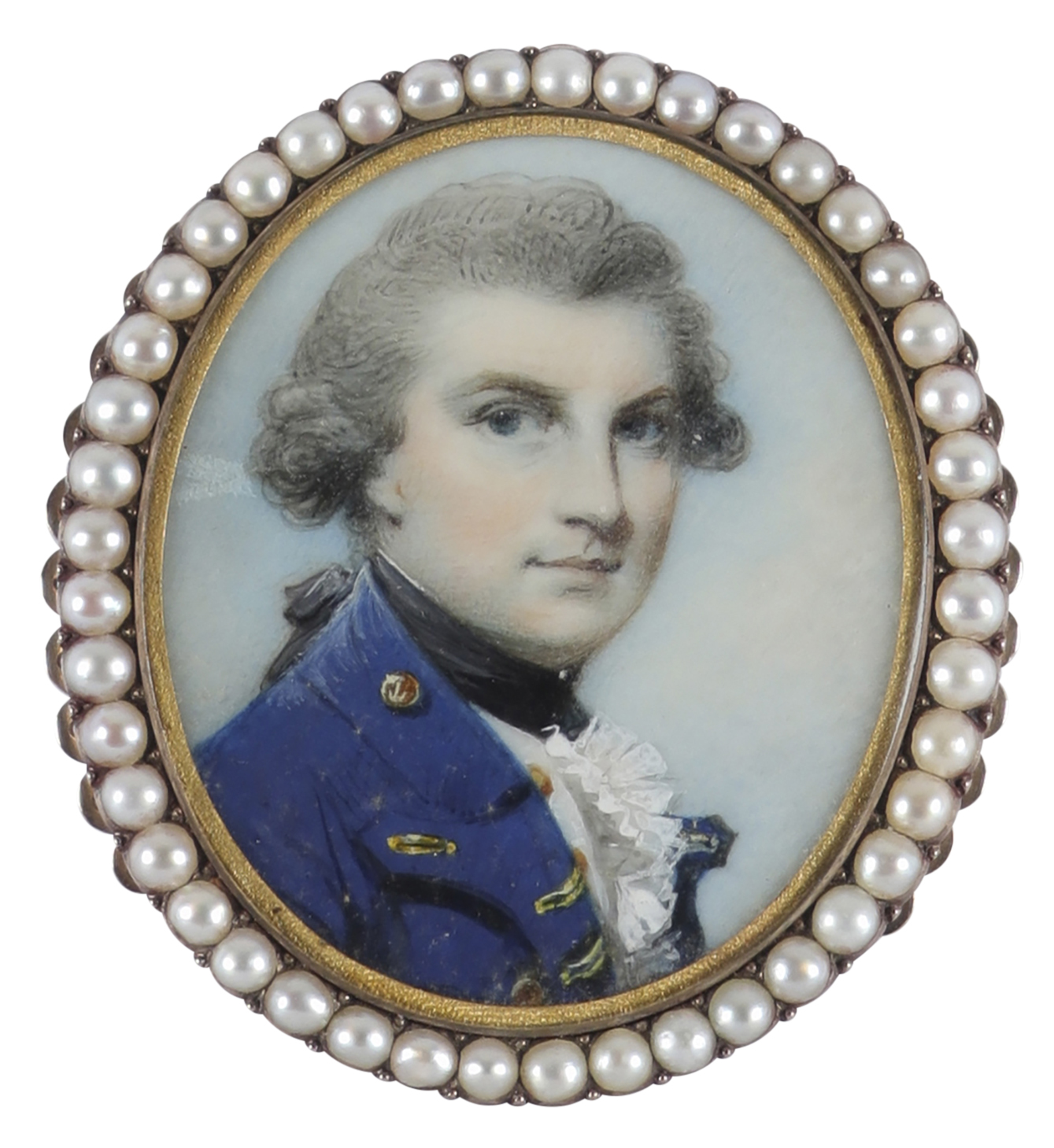 Oval, in a gilt metal frame with split pearl border, and hair back