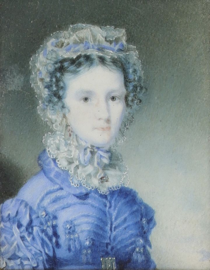 Portrait miniature of Mrs Harriet Stewart, née MacLaine, of Fasnacloich, in a blue dress and white collar and bonnet