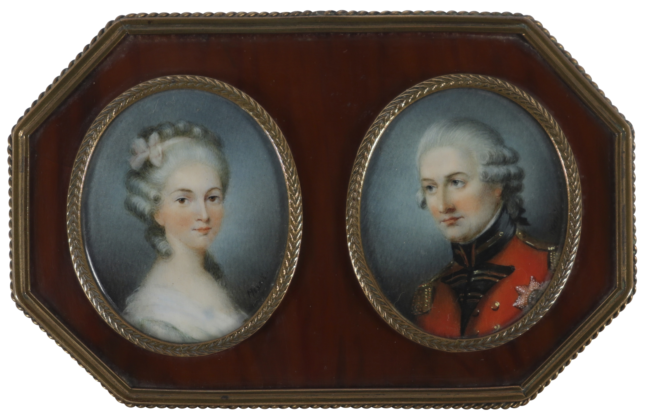 Portrait miniature of a officer wearing regimental uniform and the Order of the Garter; Portrait miniature of his wife in a white dress with powdered hair