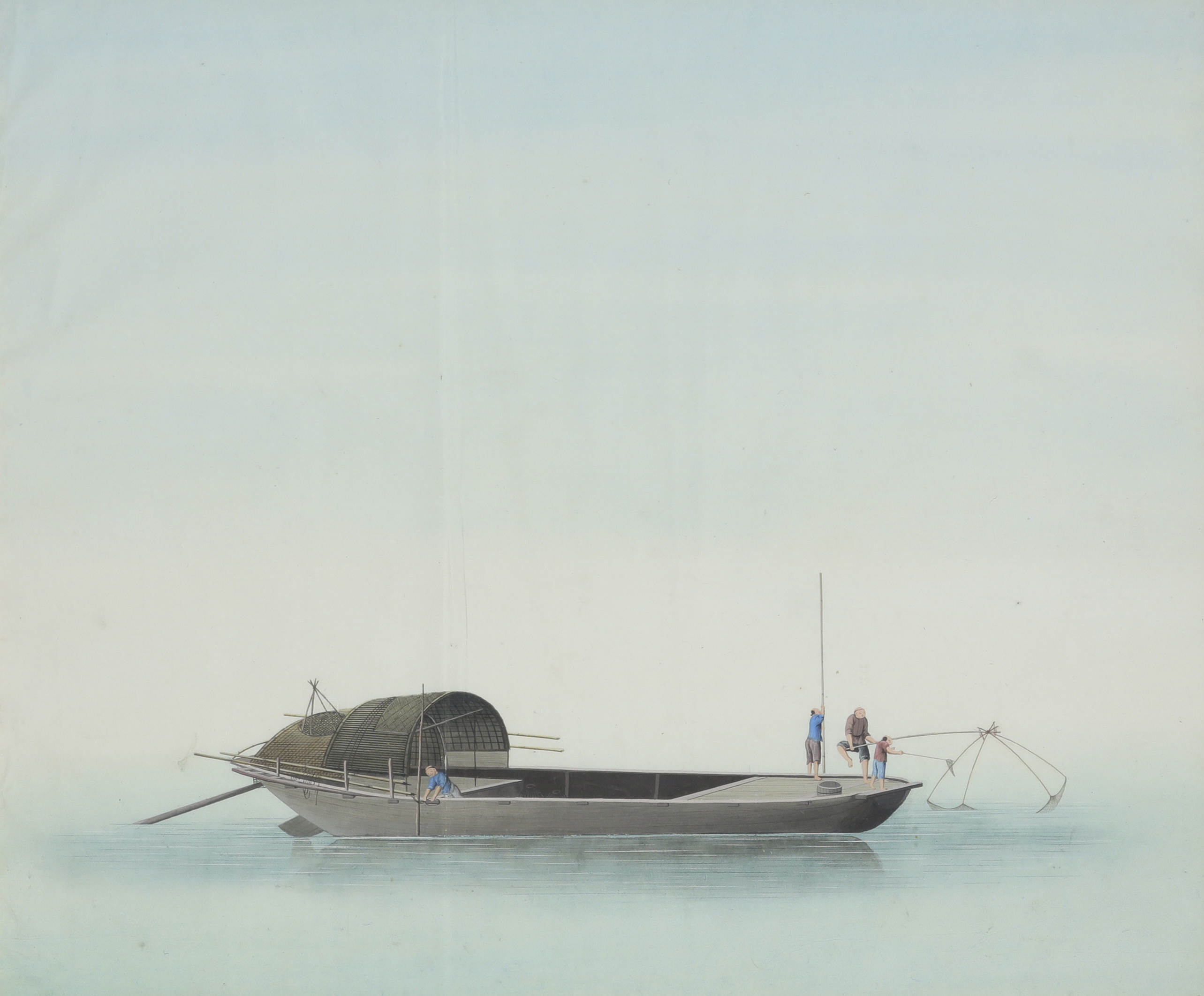 Chinese School Chinese junk with fishermen casting a net; Chinese junk with a fisherman tending...