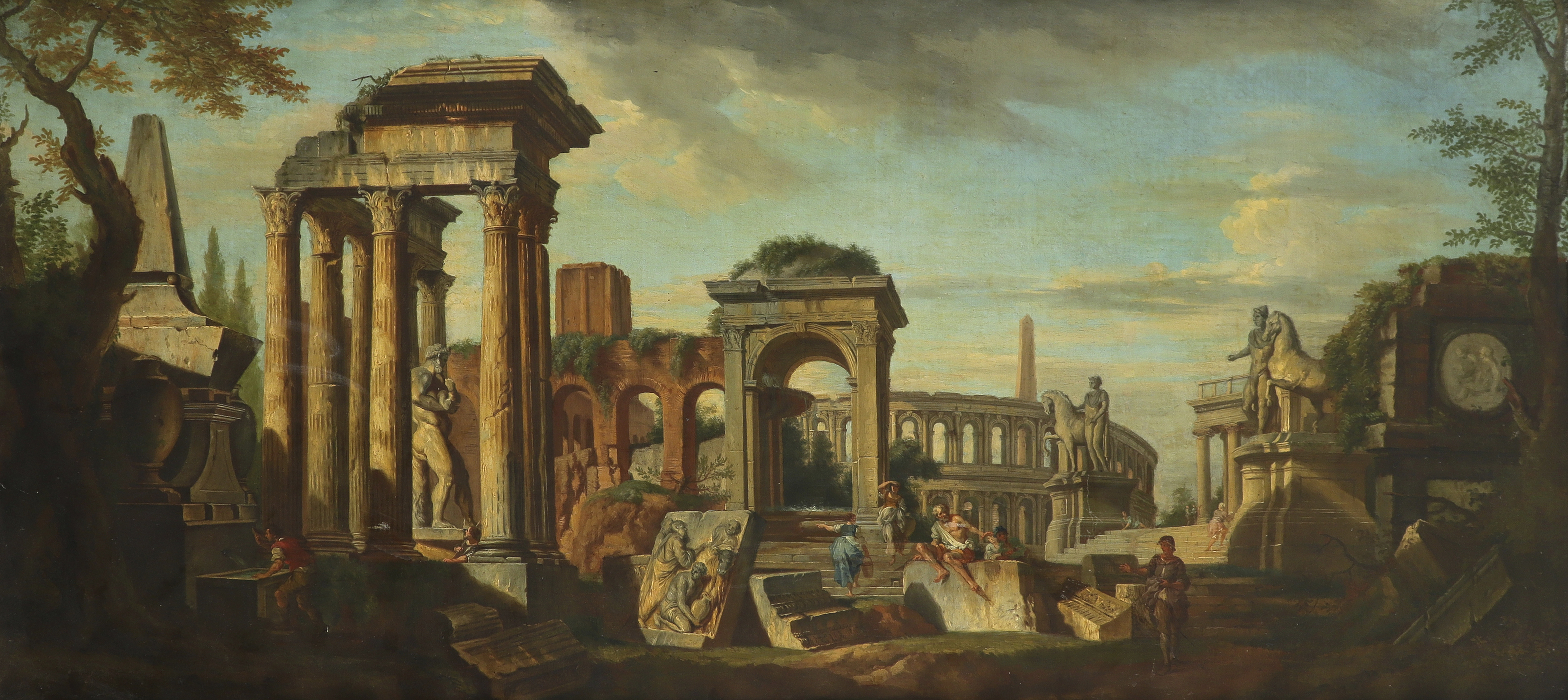 An architectural capriccio with figures amongst ruins, including the Colosseum, and the statue of Silenus with the infant Dionysus