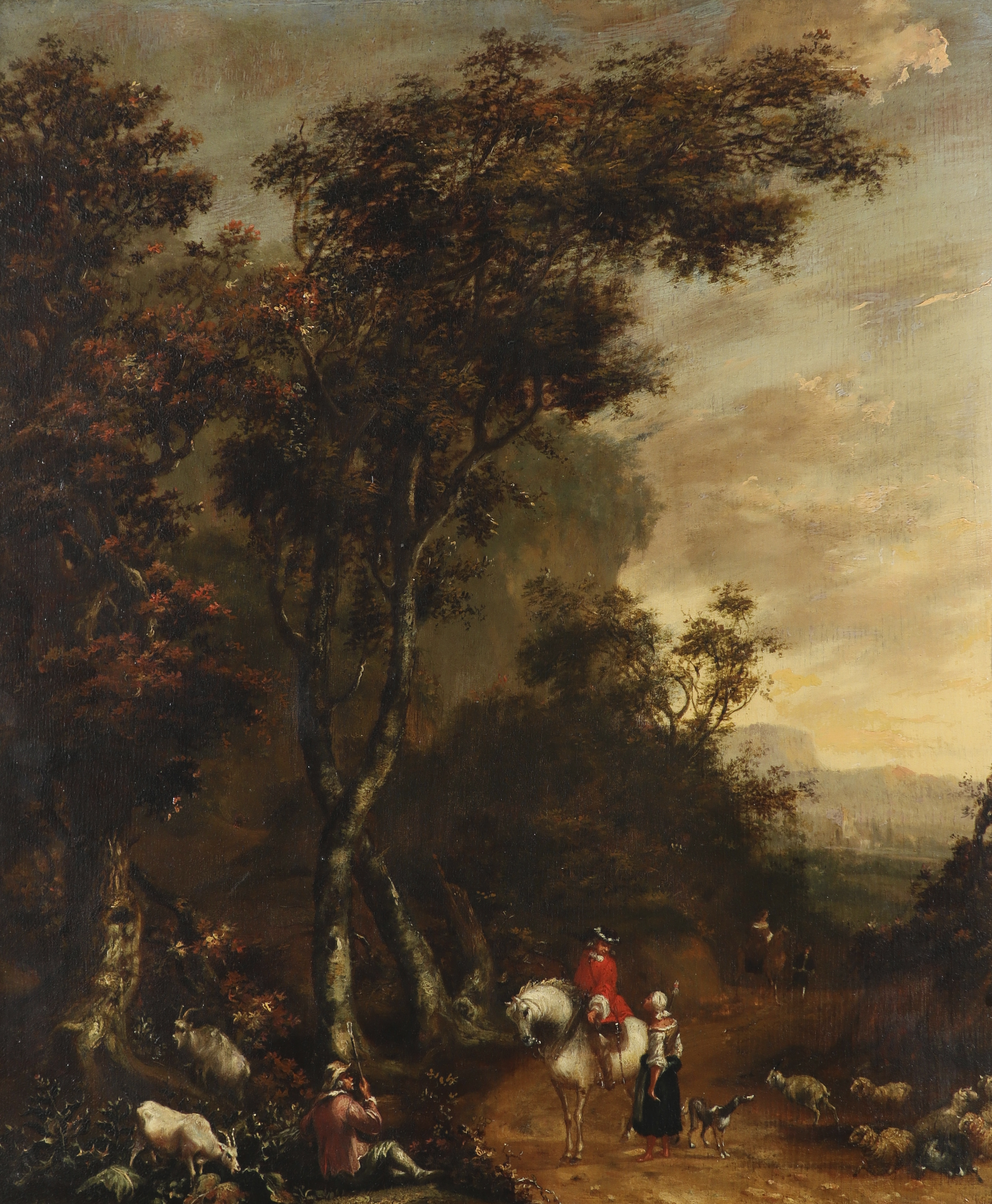 Circle of Jan Gabrielsz. Sonjé Wooded landscape with a traveller and shepherds on a path Oil on...