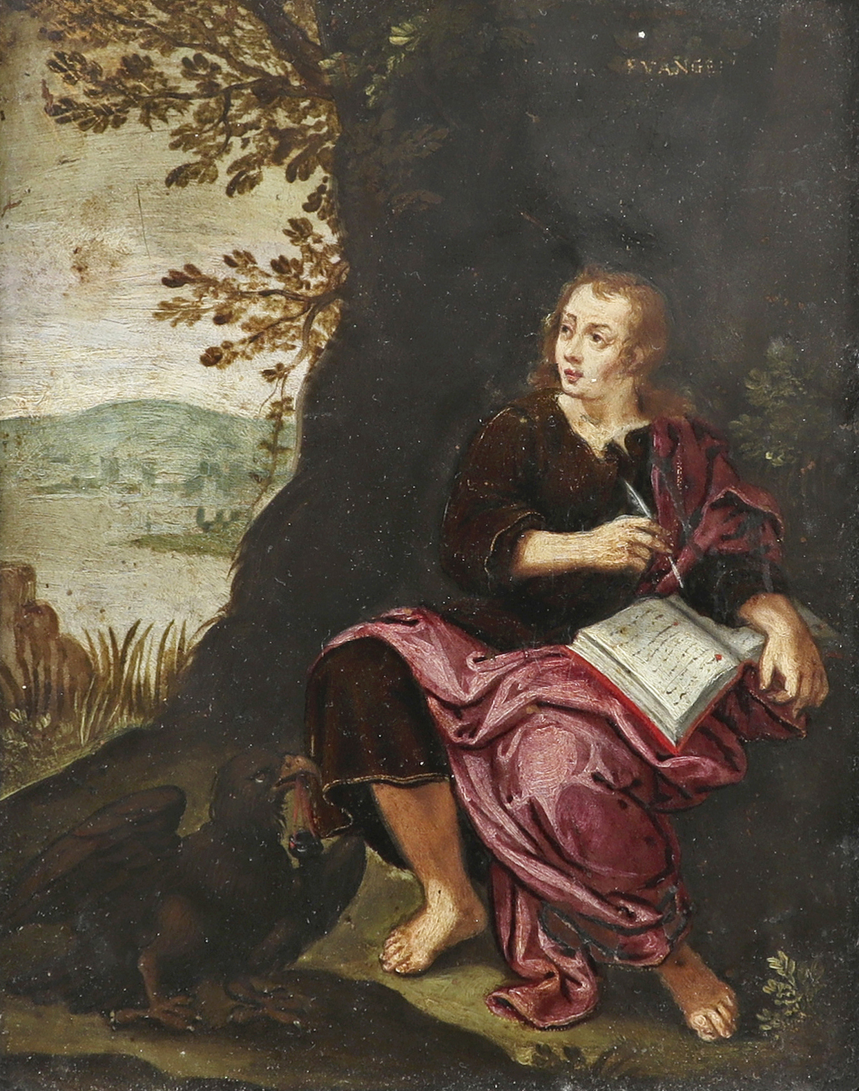 Flemish School 17th Century St John the Evangelist on the island of Patmos Oil on copper 19 x...