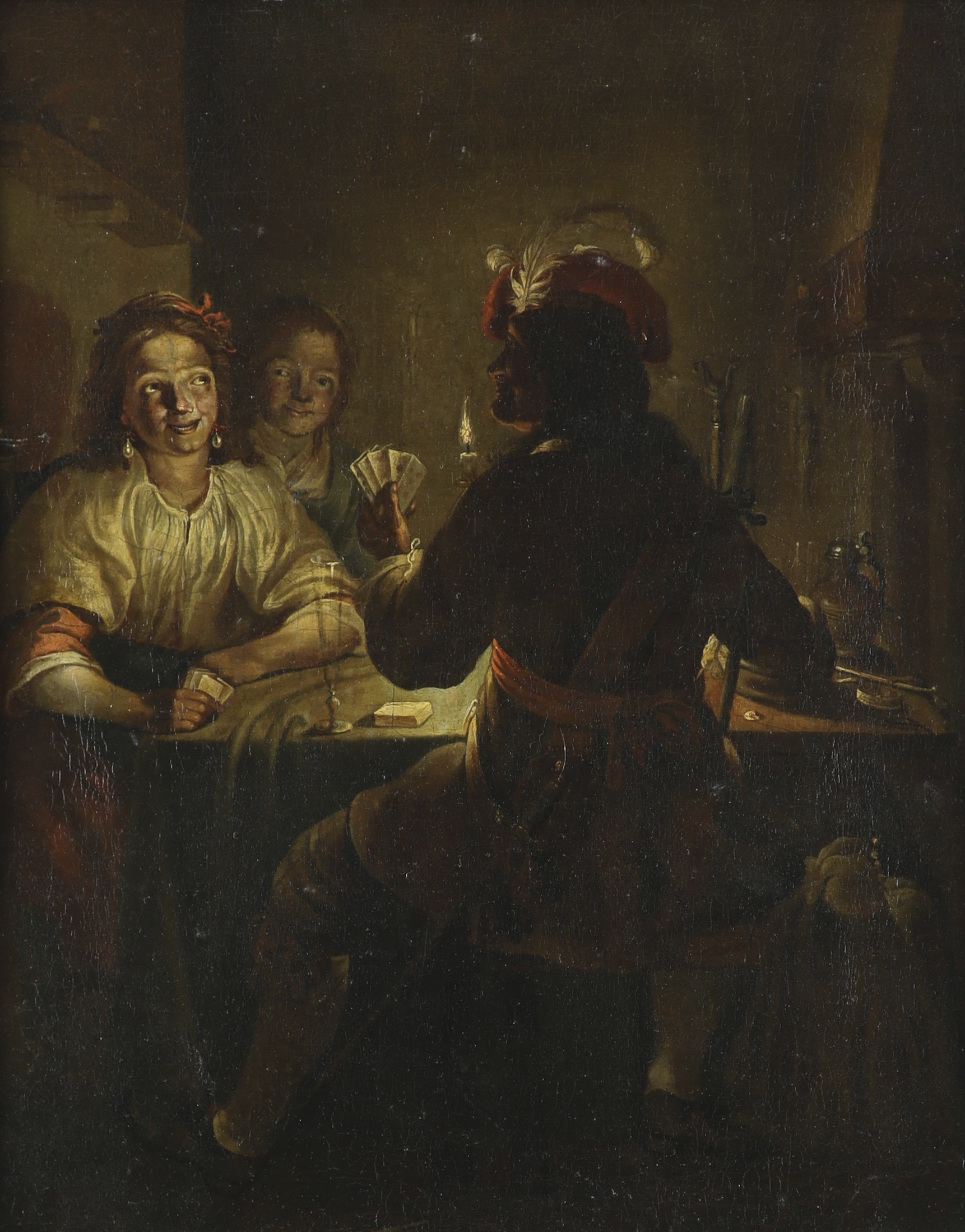 his postumous sale, Berlin, Cassirer and Helbing, 7 December 1926, lot 34 ('Jacob Duck. Kartenspieler. Soldat und Mädchen beim Kartenspiel. Ein zweites Mädchen sieht zu. Auf dem Tisch eine brennende Kerze'), and authenticated by Cornelis Hofstede de Groot in 1925;