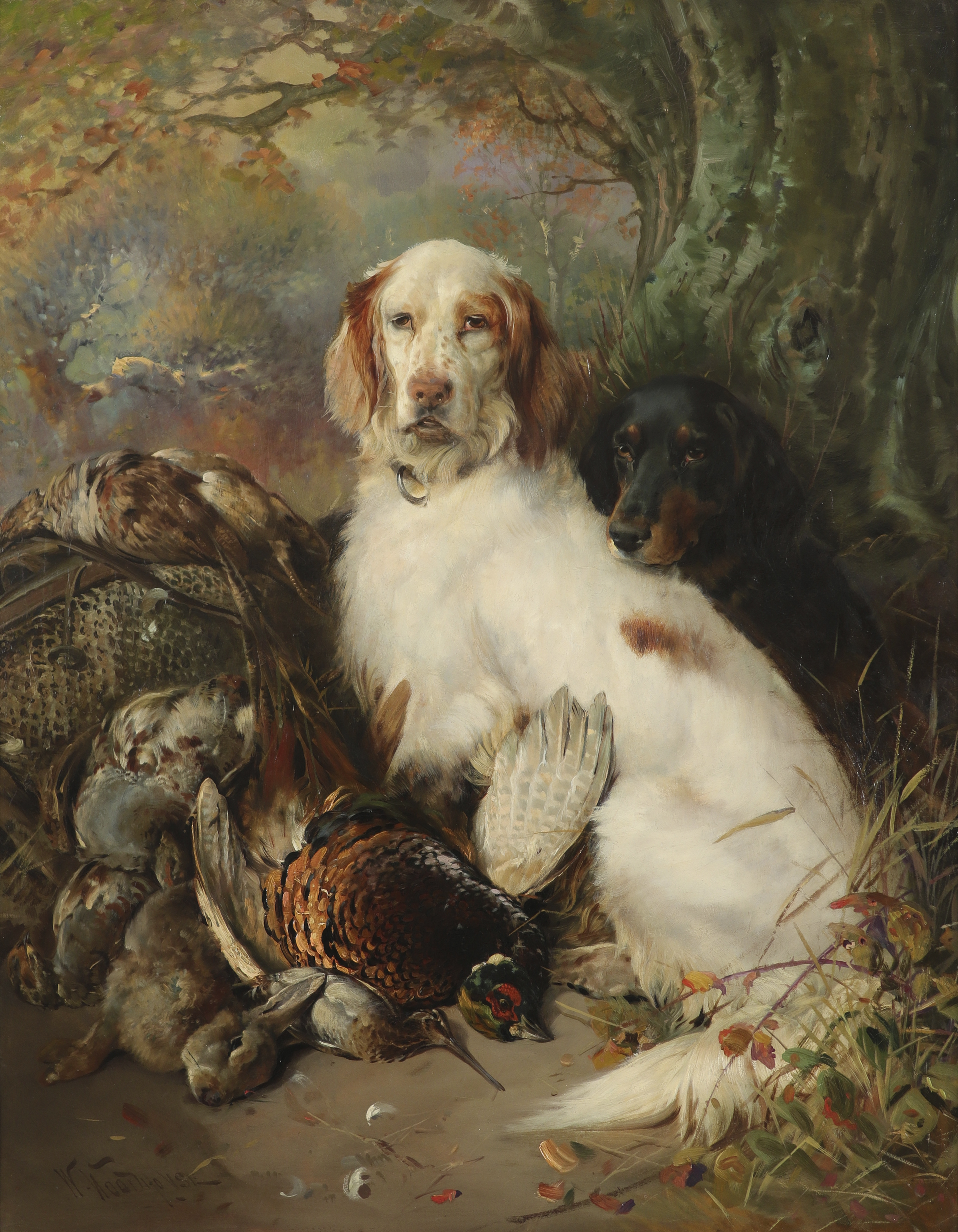 William Woodhouse (1857-1939) End of the day; an English and a Gordon setter with game Signed Oil...