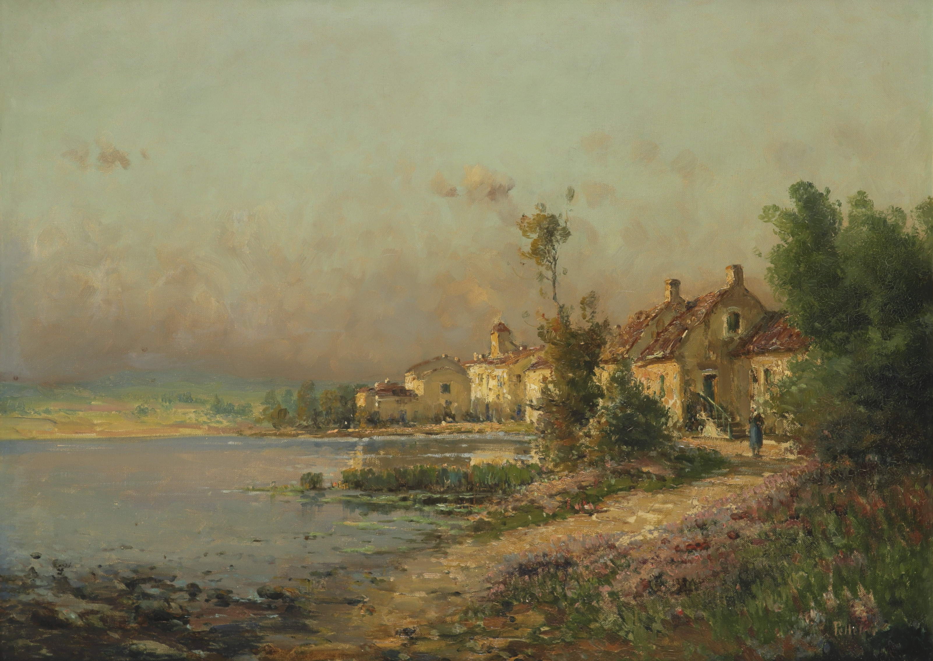 Pierre Jacques Pelletier (French 1869-1931) Landscape with houses by a lake Signed Oil on canvas...