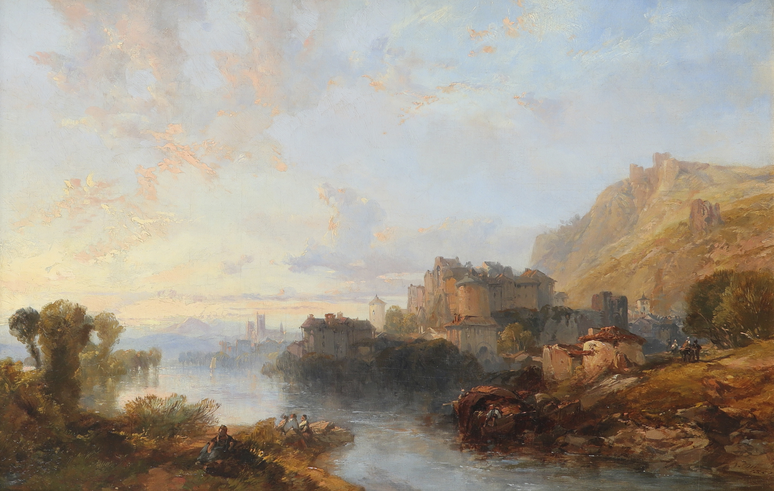 James Duffield Harding OWS(1797-1863) A continental river landscape with figures by a castle and...