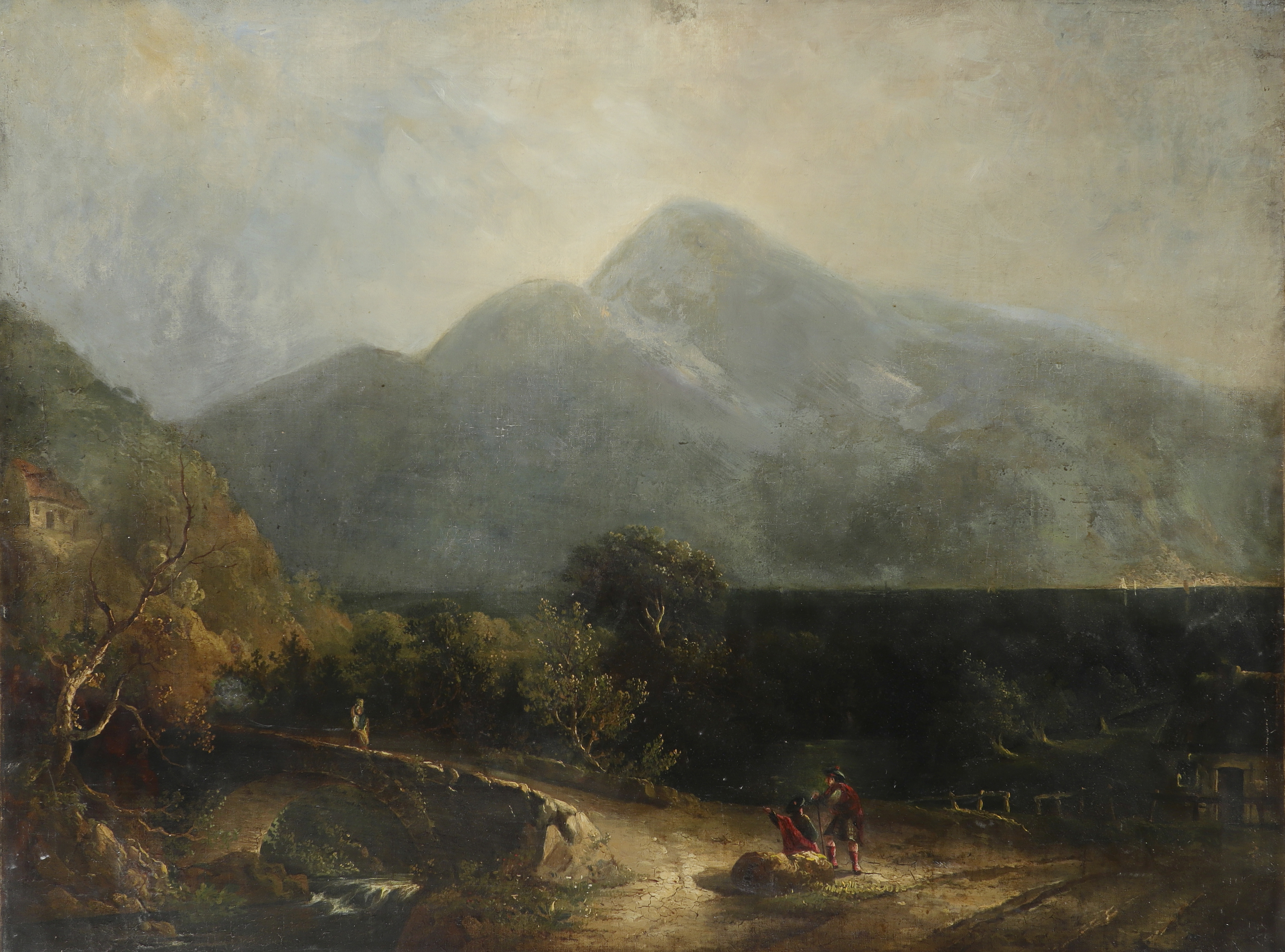 Scottish School 19th Century Mountainous landscape with figures by a bridge Variously inscribed...