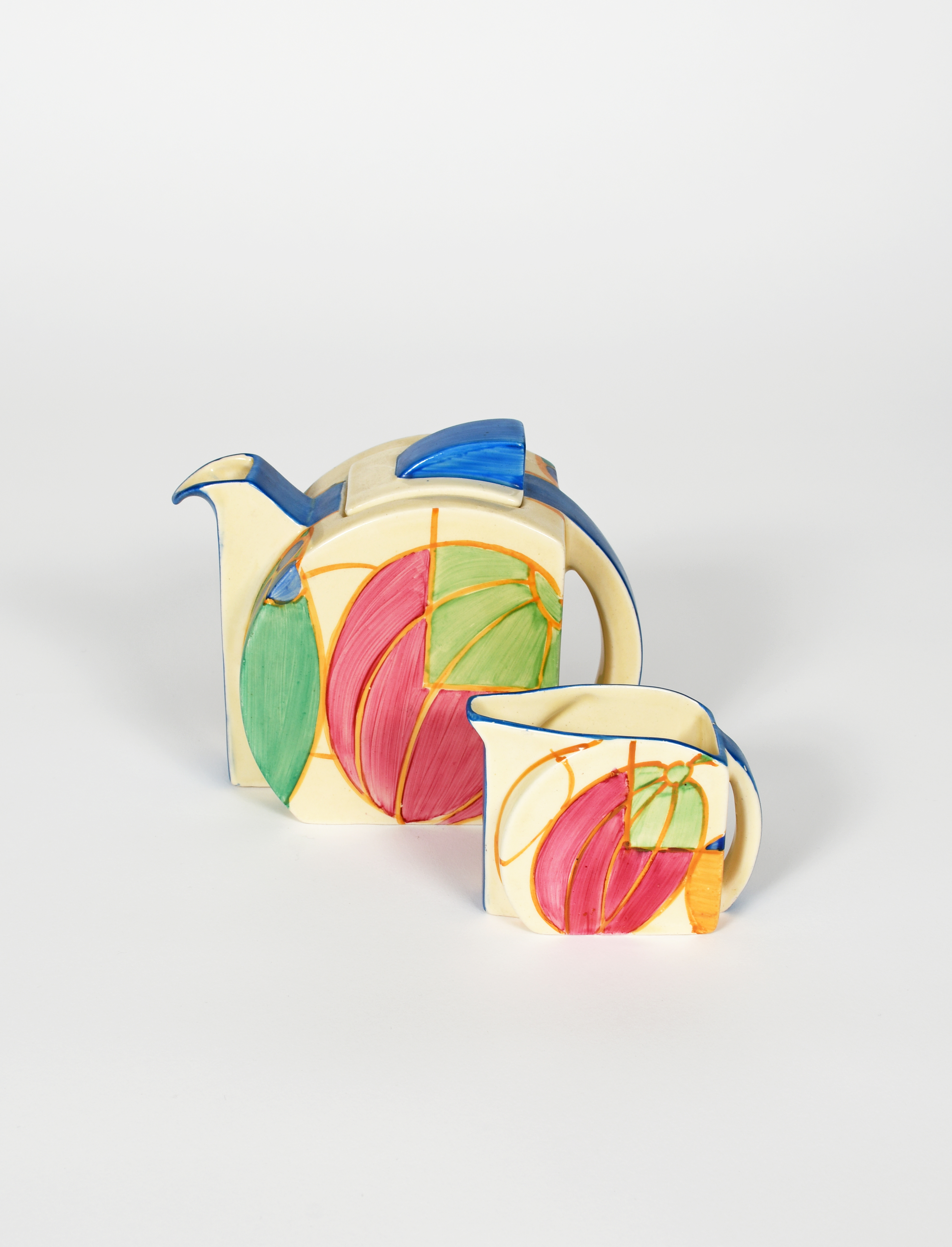 'Pastel Melon' a Clarice Cliff Fantasque Bizarre Stamford teapot and milk-jug. retailed by Lawley's, painted in colours, comprising teapot and cover and milk-jug, printed factory marks, 12.5cm. high (3)
