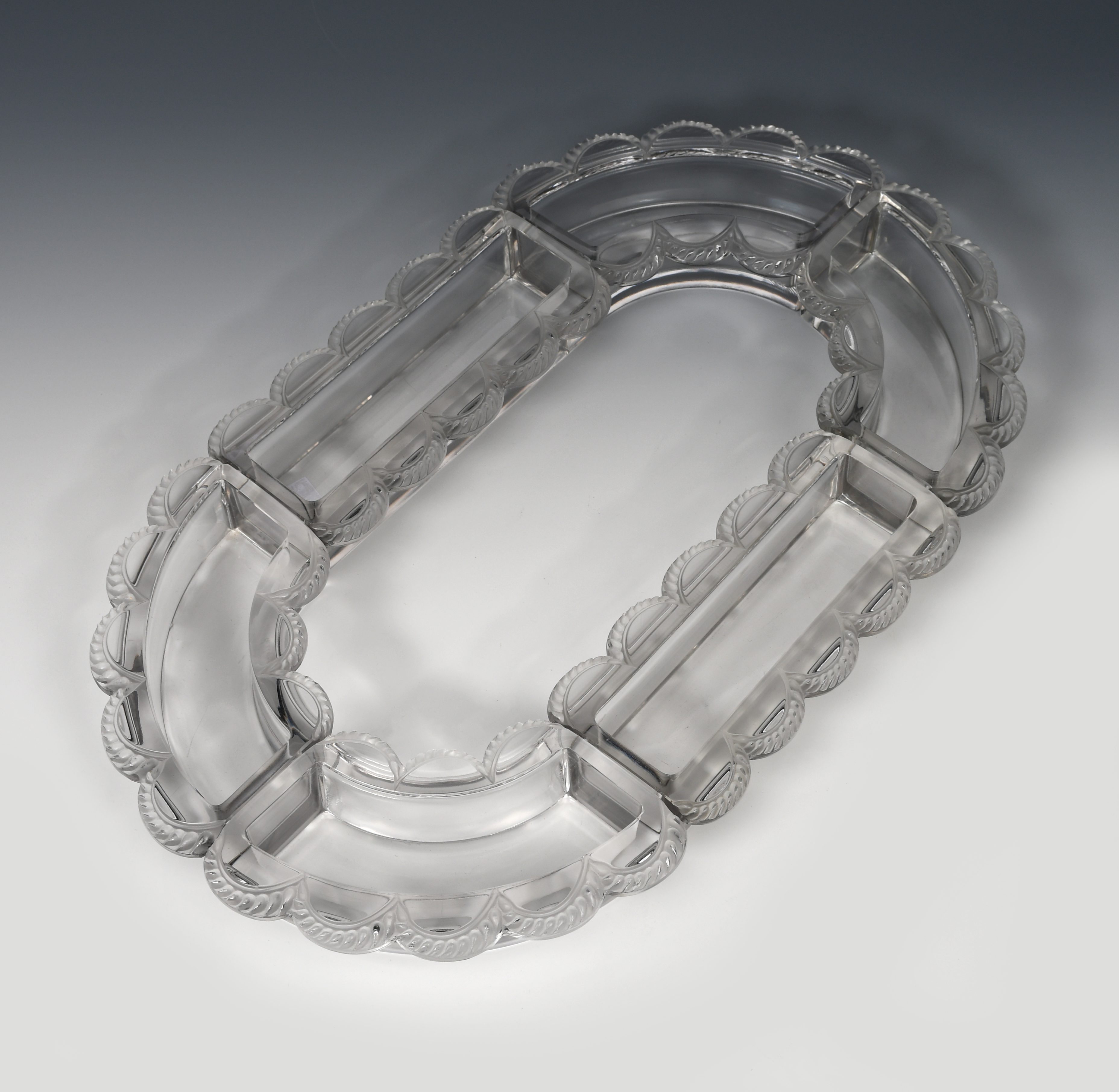 'Festons' no.10-3472 a modern Lalique clear and frosted glass table centrepiece originally designed by Rene Lalique, comprising, two rectangular troughs and four curved troughs, etched Lalique France, 20cm. long, (6)