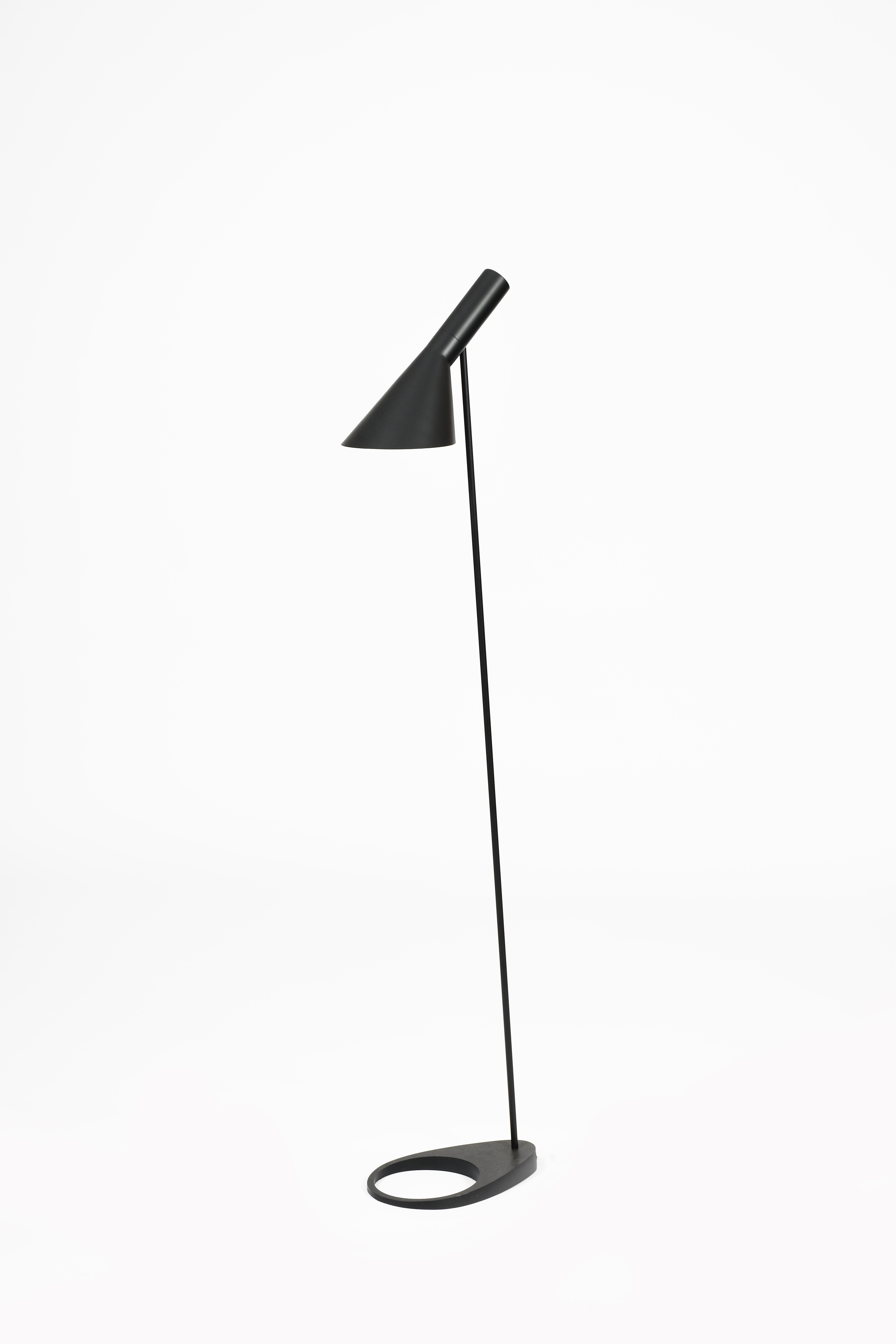 An AJ floor lamp designed by Arne Jacobsen, probably manufactured by Louis Poulsen, originally designed in 1960 for the SAS Royal Hotel, Copenhagen, matt black finish, 131cm. high