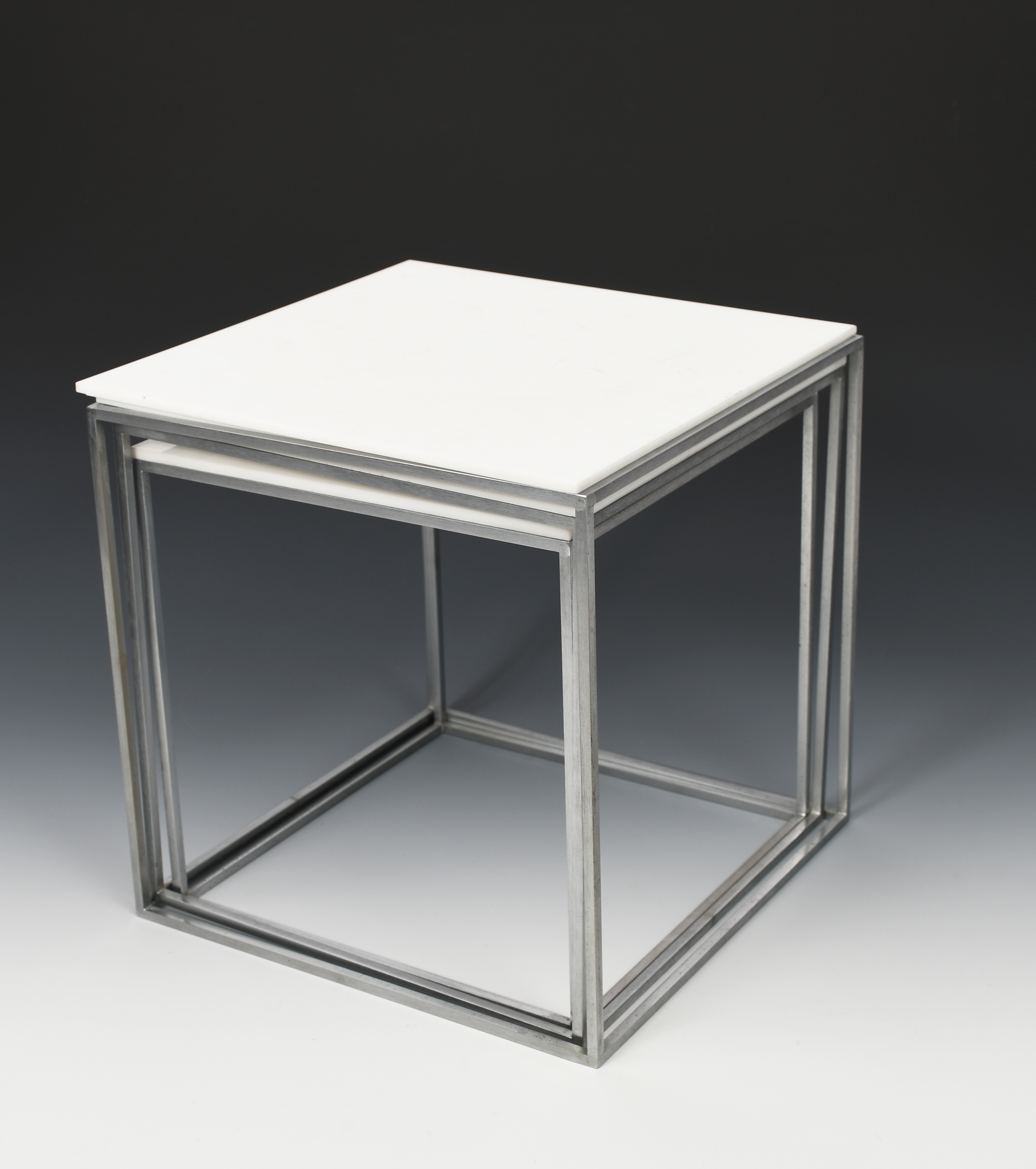 A nest of three Fritz Hansen PK71 occasional tables designed by Poul Kjaerholm, white acrylic top surface on stainless steel metal frame, unsigned, 28cm square, (28cm high) (6)
