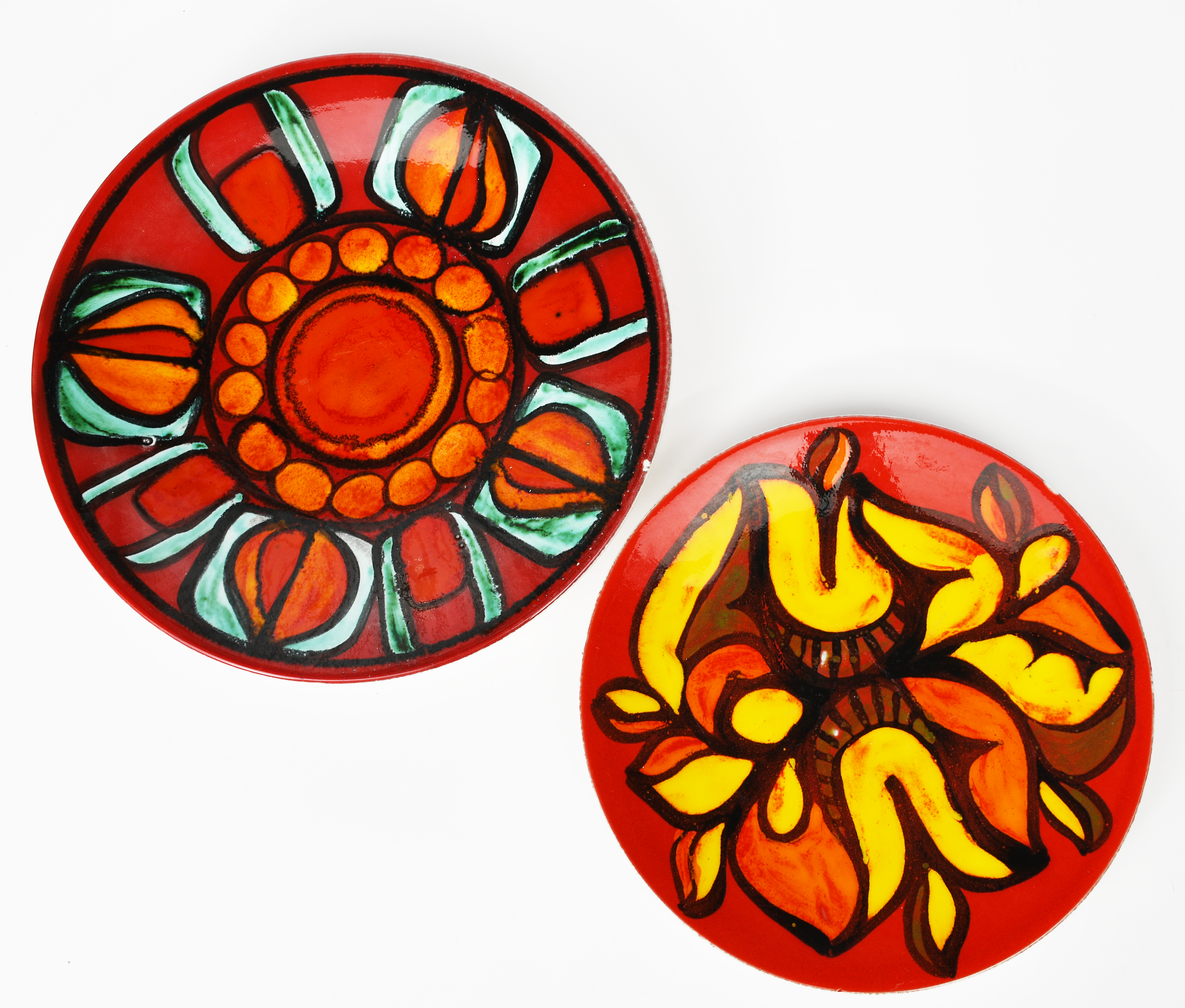 A Poole Pottery Delphis charger painted by Angela Wyburgh, shape no. 54, painted with a radiating flowerhead design, in shades or red, orange, black and turquoise, and another Poole Delphis charger smaller, printed and painted marks, 41cm. diam. (2)