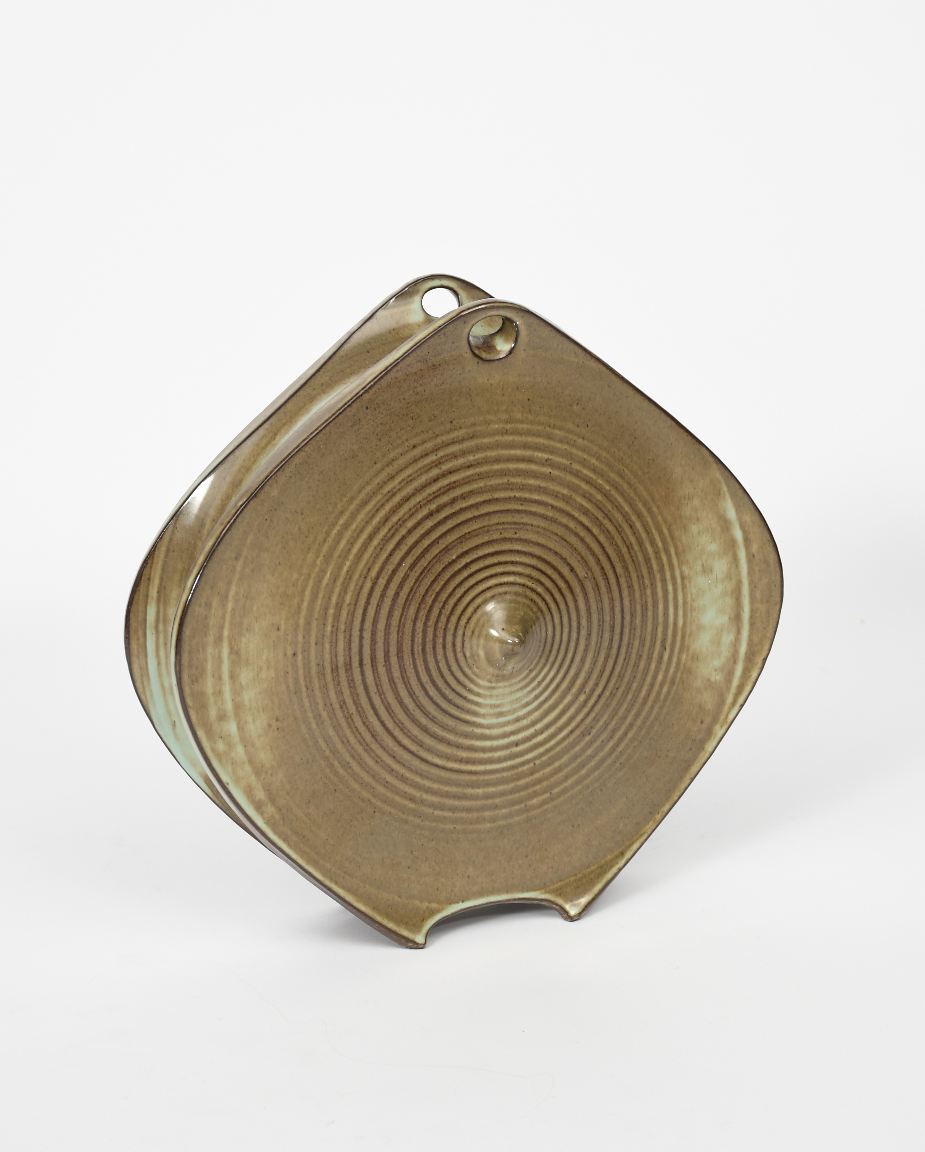 A Poole Pottery Studio vase by Guy Sydenham, swollen, flat sided form on four spike feet, the sides with raised points, the pierced top with single small solifleur aperture, covered in a mottled turquoise and mushroom glaze, impressed Poole England and GS monogram 26.5cm. high