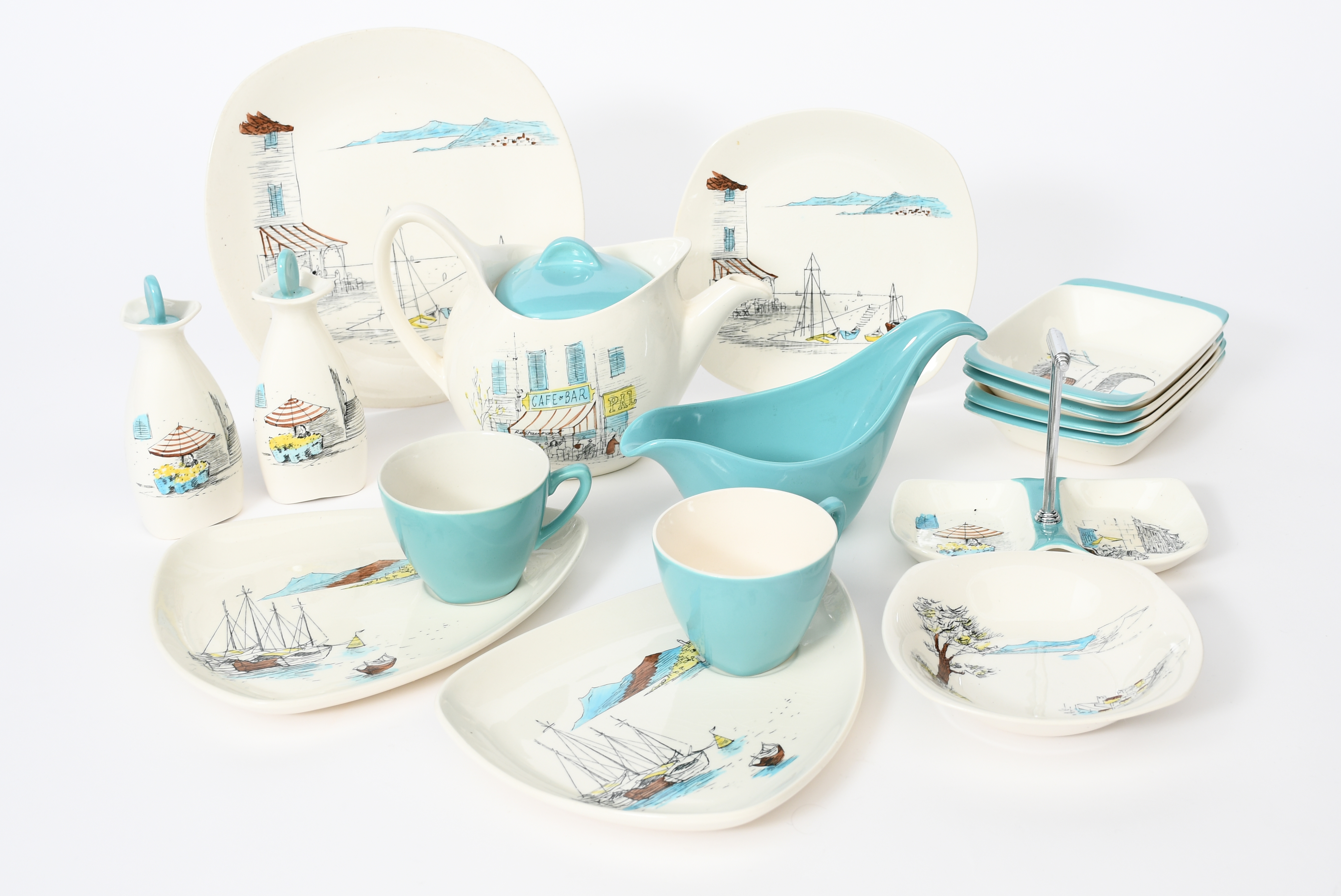 'Cannes' a Midwinter Fashion Shape part service with drawing by Hugh Casson, printed in colours with vignette, comprising; platter, three various serving dishes, four twin-handled dishes, olive dish with chrome handle, tureen cover, twin-handled cup, teapot and cover, two cups with tray saucers, two oil bottles, one blue serving jug, a dessert bowl, twelve plates, seven various saucers and sixteen side plates, a cake plate, seven various blue cups, printed factory marks, 30.5cm. wide (platter, (a lot)