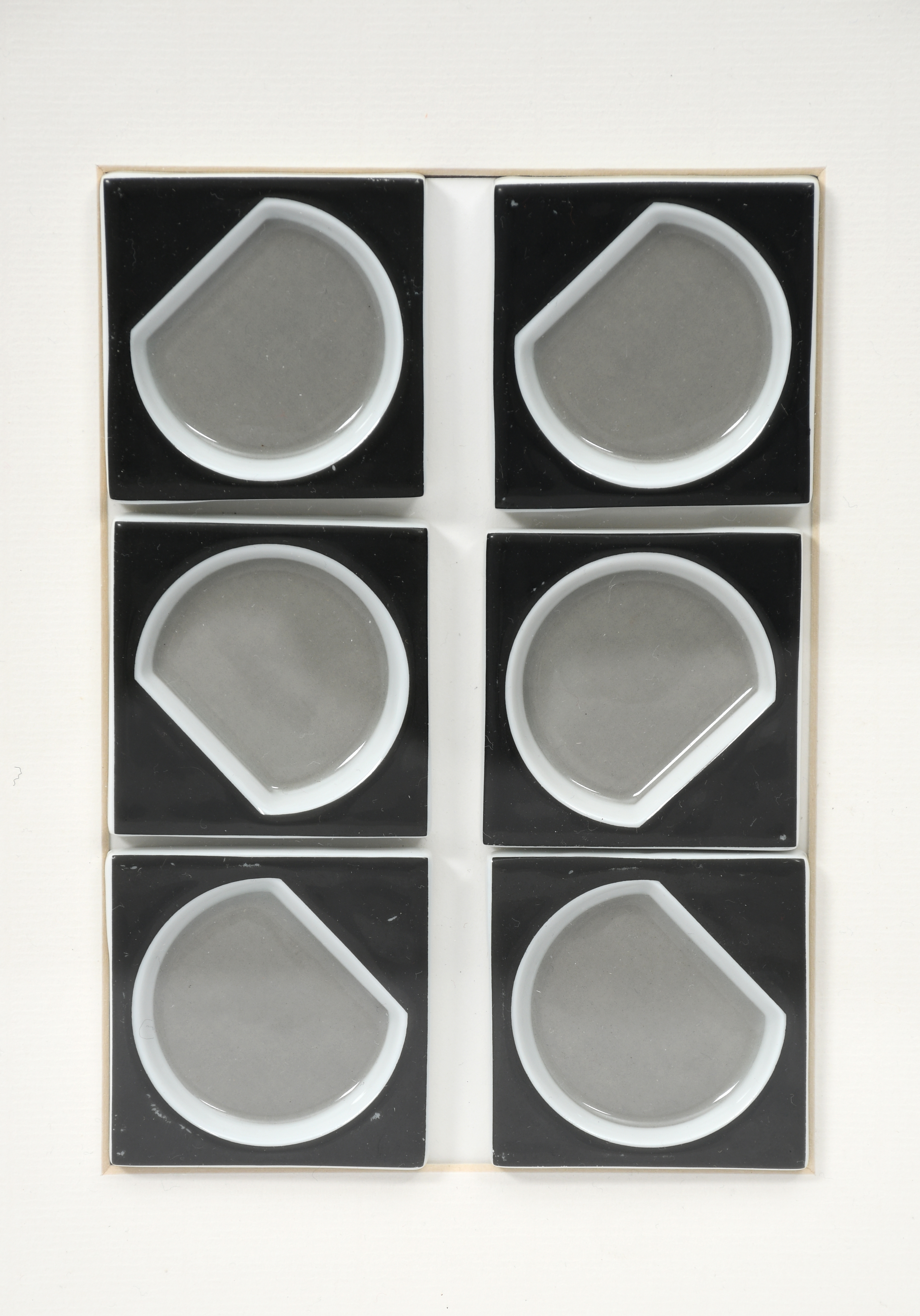 A Rosenthal Studio Haus porcelain tile panel designed by Victor Vasarely, six tiles cast in low relief with geometric design, glazed grey and black, mounted in a modern frame, marks concealed, 5cm square (each tile), 31 x 25cm (frame)