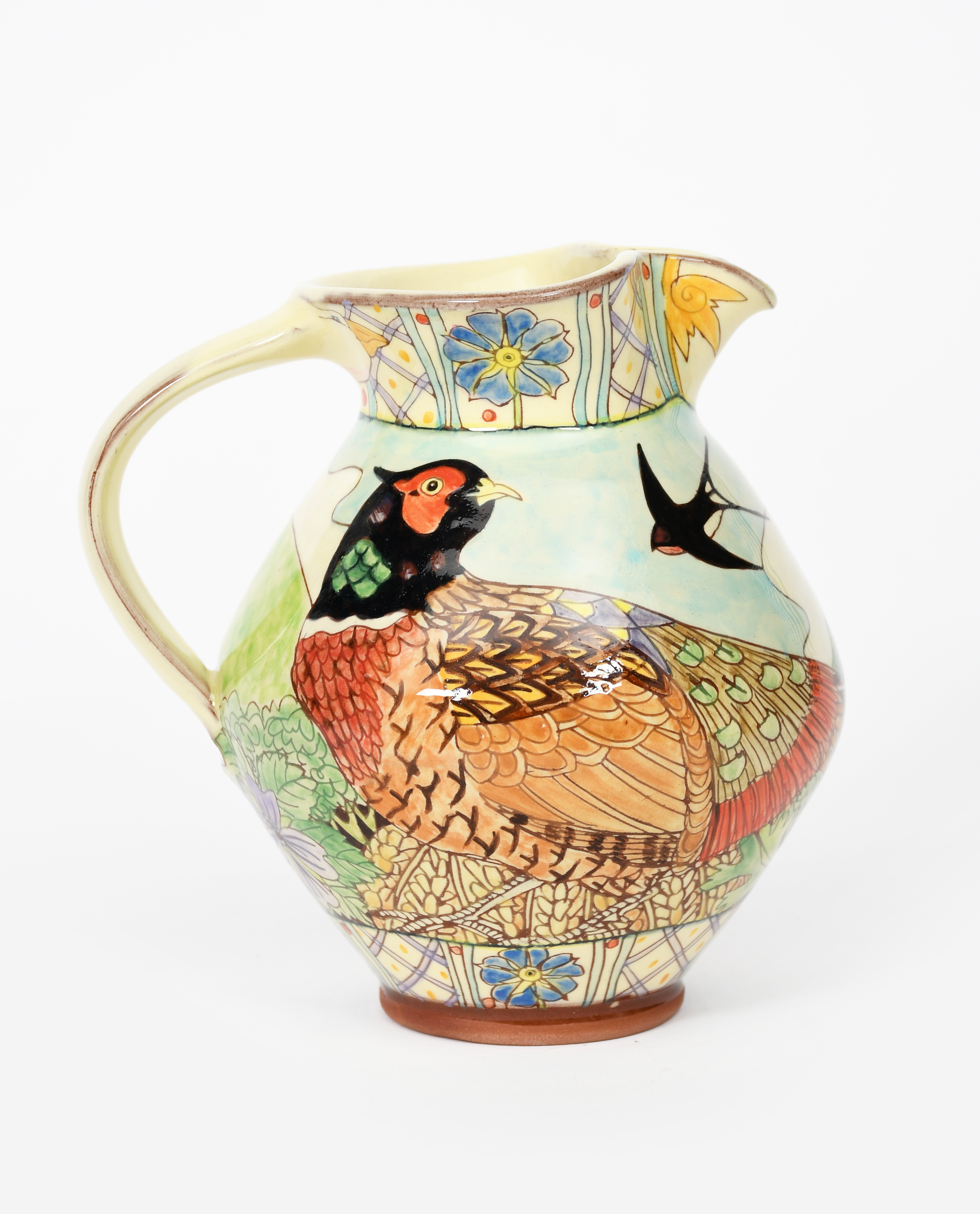 a pottery jug, bellied form, painted with a hare running below a swooping swallow, the reverse a pheasant, in colours impressed marks, 16cm. high
