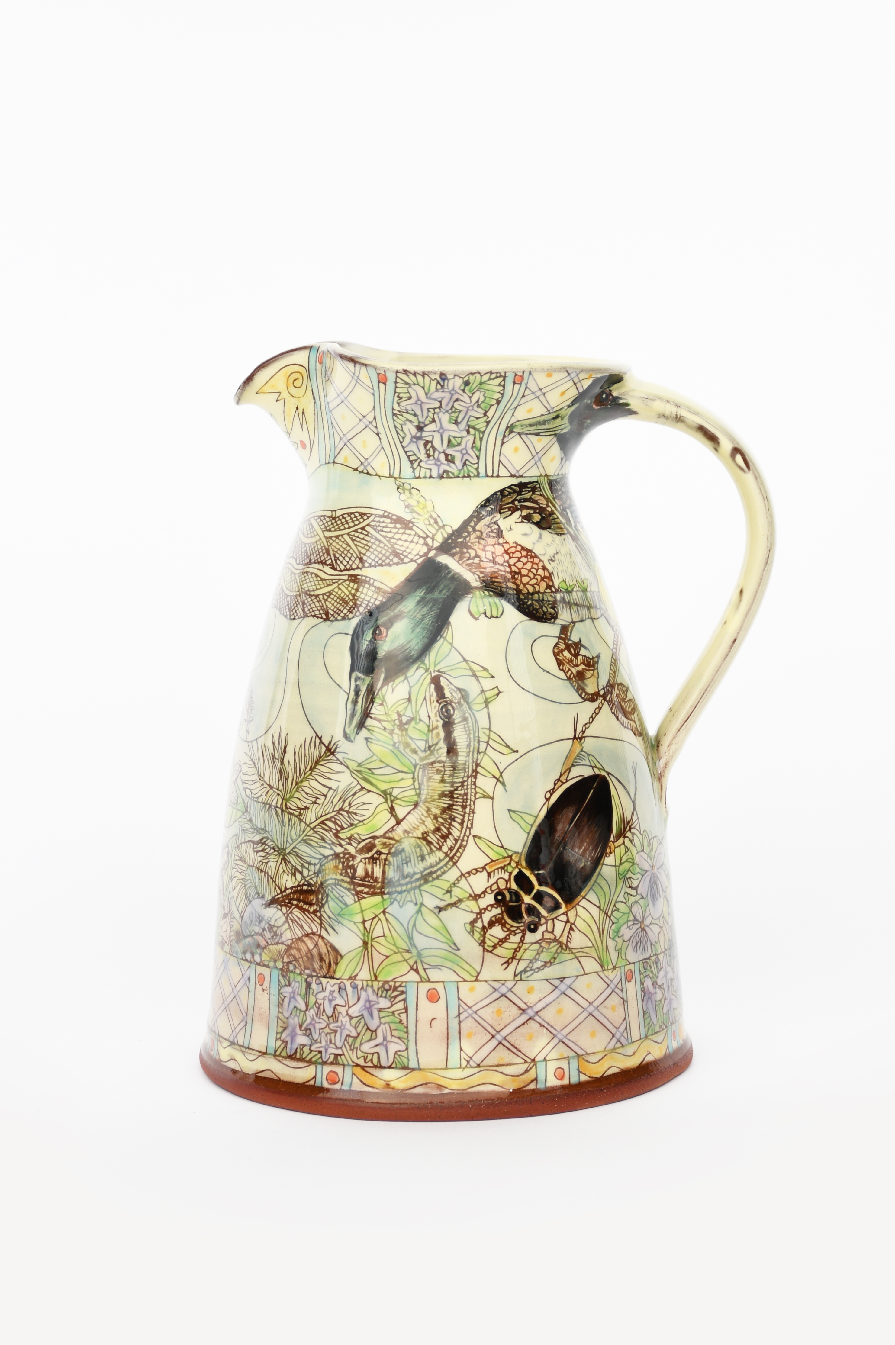 a pottery tall jug, painted with mallard duck flying above an eel and water-beetle, the reverse with a large dragonfly and fish, in colours impressed seal mark, 23cm. high
