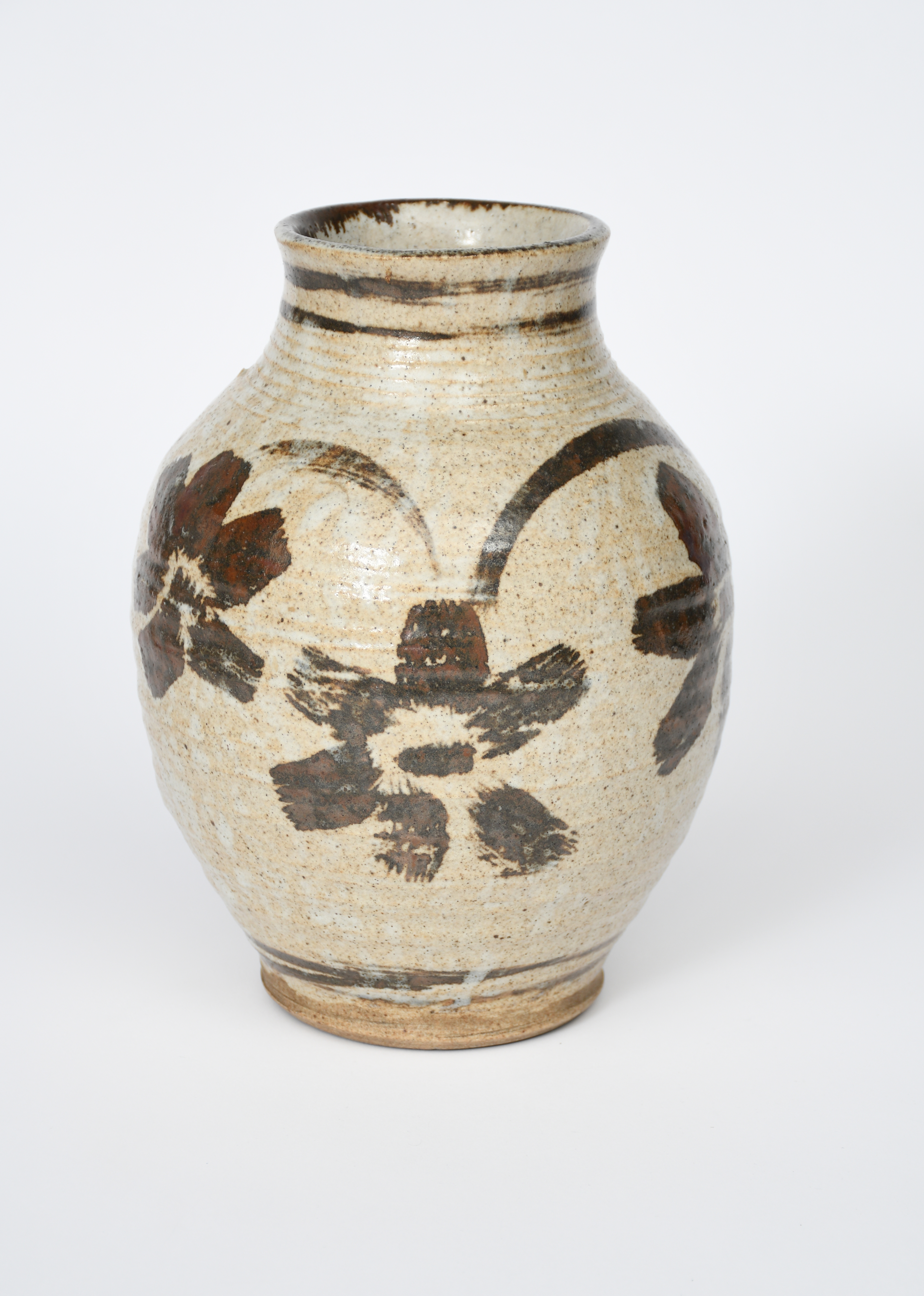 a shouldered stoneware vase, painted with stylised flower stems, in iron on a translucent oatmeal ground impressed seal mark, 25.5cm. high
