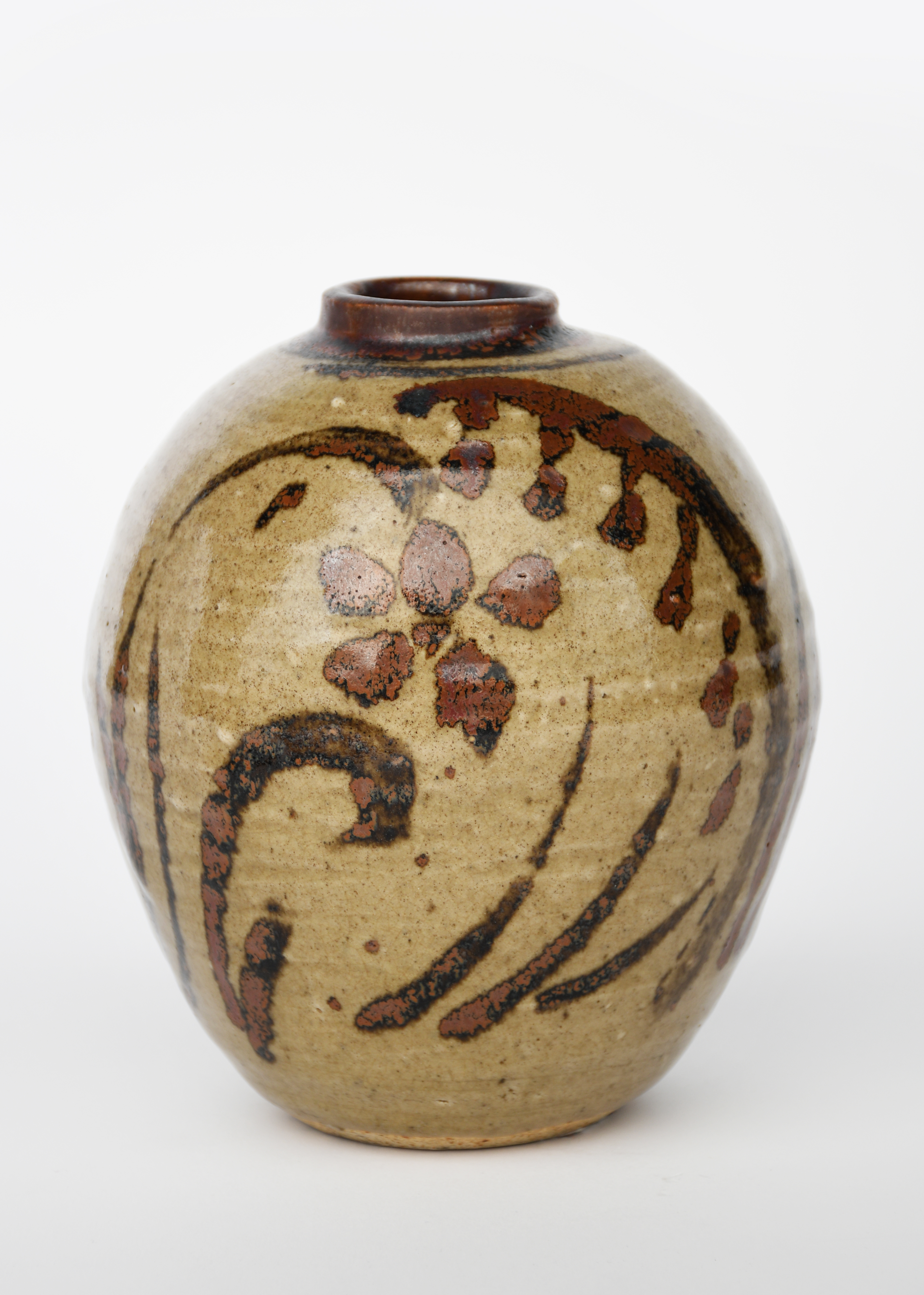 a stoneware vase, shouldered ovoid form with collar rim, painted with flower sprays and grasses in iron on a rust ground impressed seal mark, 17cm. high