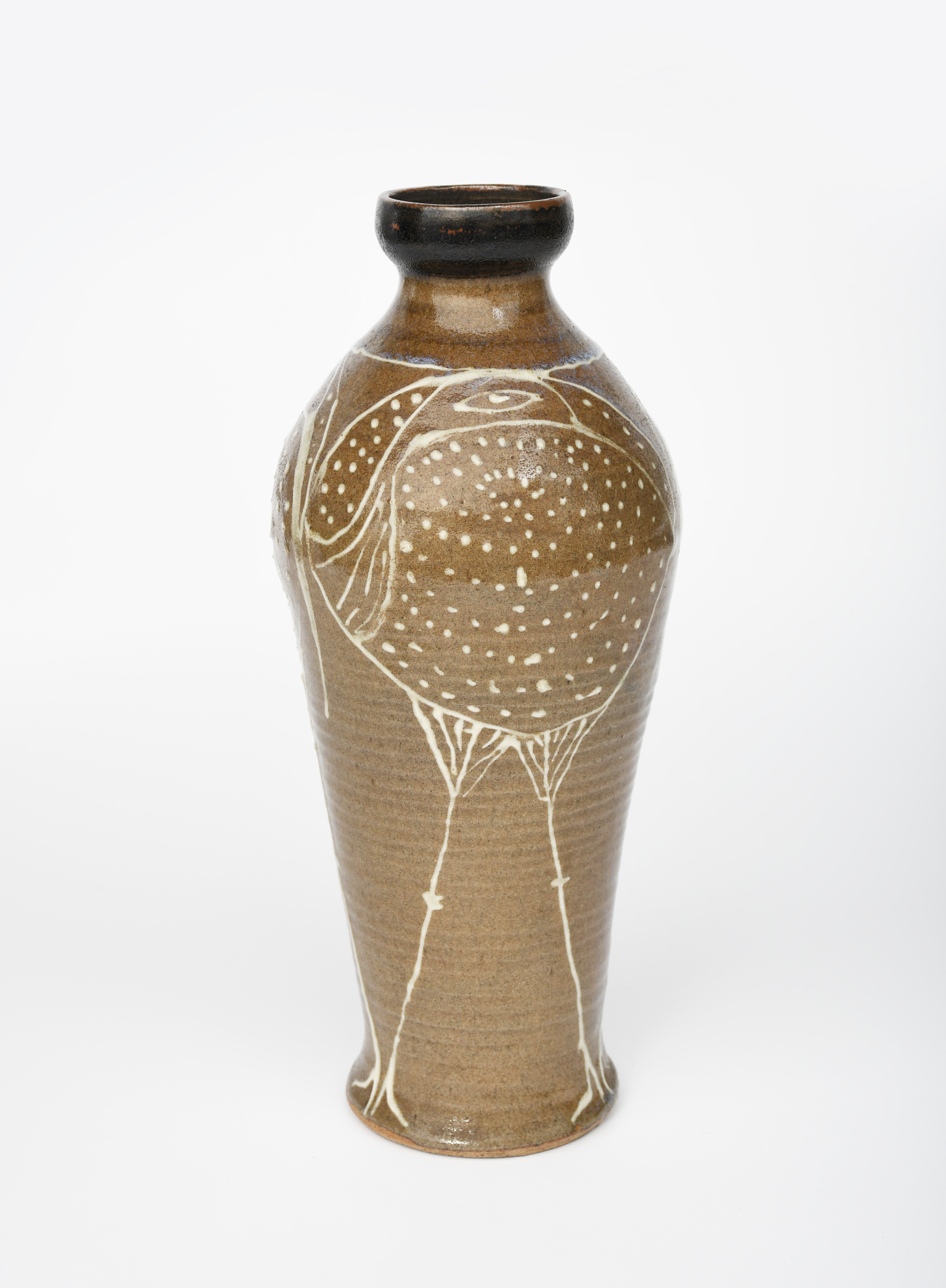 'Dark Celadon White Birds' a fine tall stoneware vase, slender shouldered cylindrical form with stork neck and collar rim, slip decorated with three curlew in white with lavender translucency, on an oatmeal ground, impressed seal mark, paper exhibition label no.6, 40cm. high