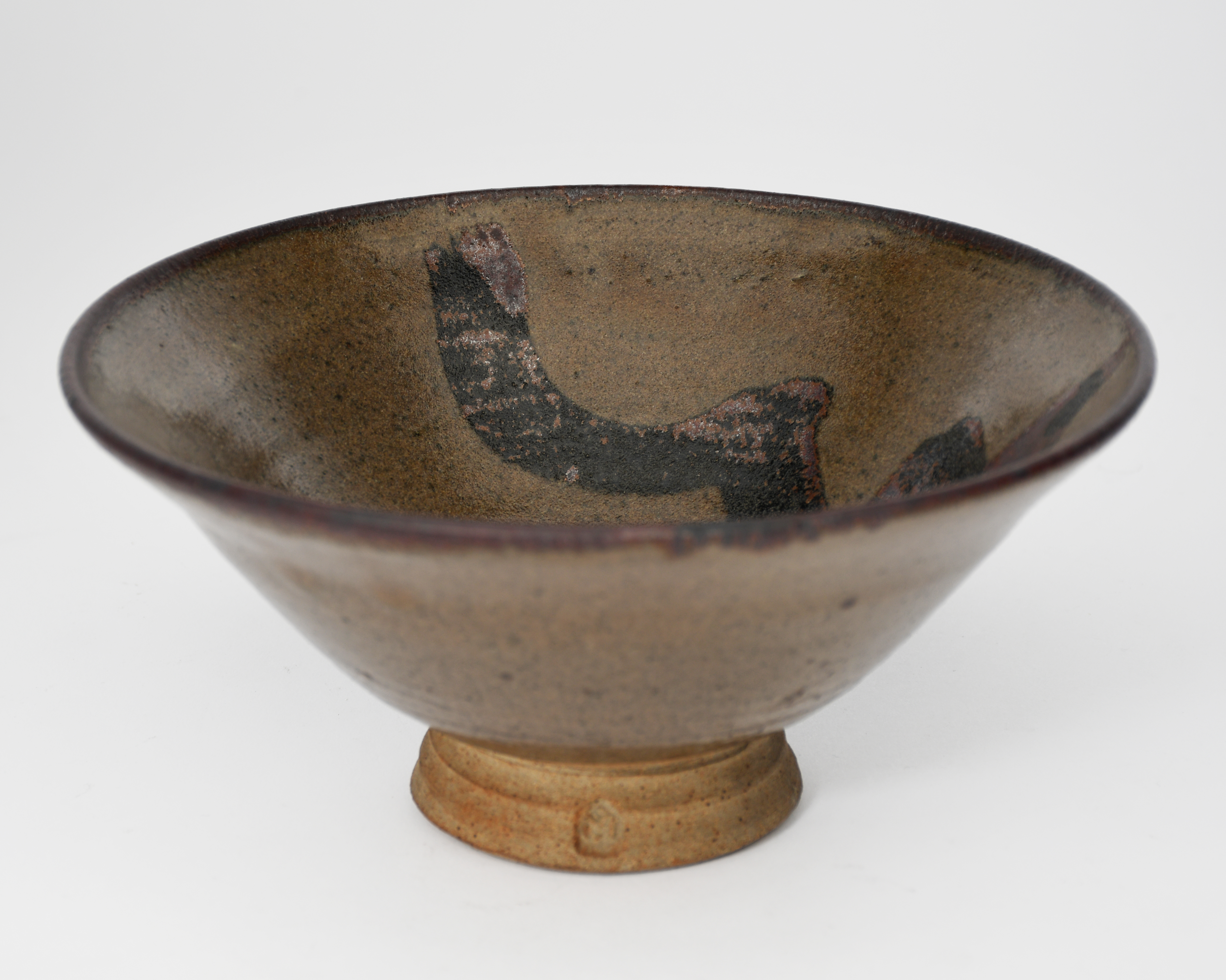a stoneware footed bowl, flaring conical form painted with simple brushed motif, on oatmeal ground, impressed seal mark, 21cm. diam.