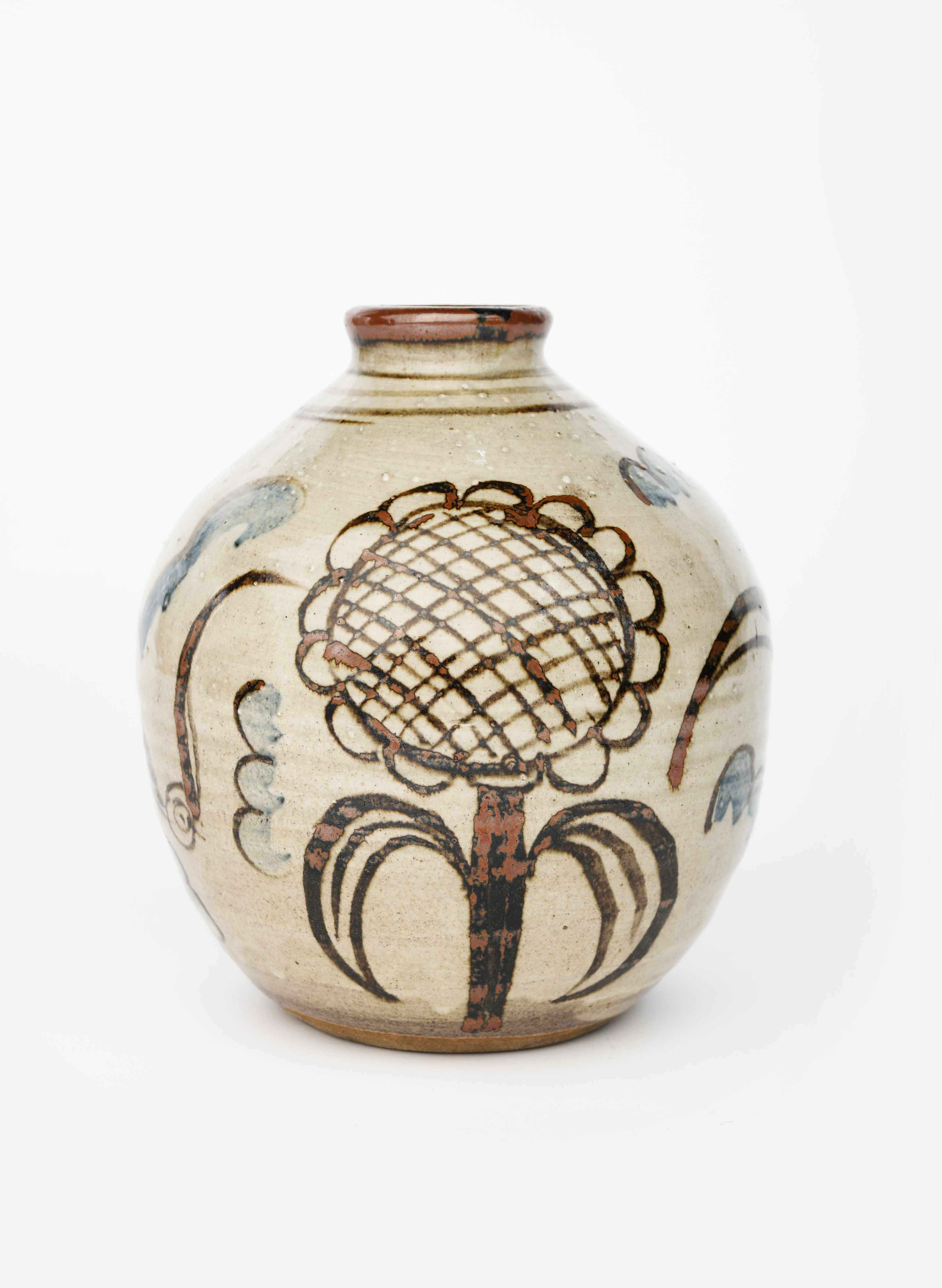 'Sun and Air' a fine stoneware vase, painted with a hot-air balloon flying amongst seagulls and clouds, the reverse a large sunflower. rust on an oatmeal ground highlighted with blue, impressed seal mark, 22.5cm. high