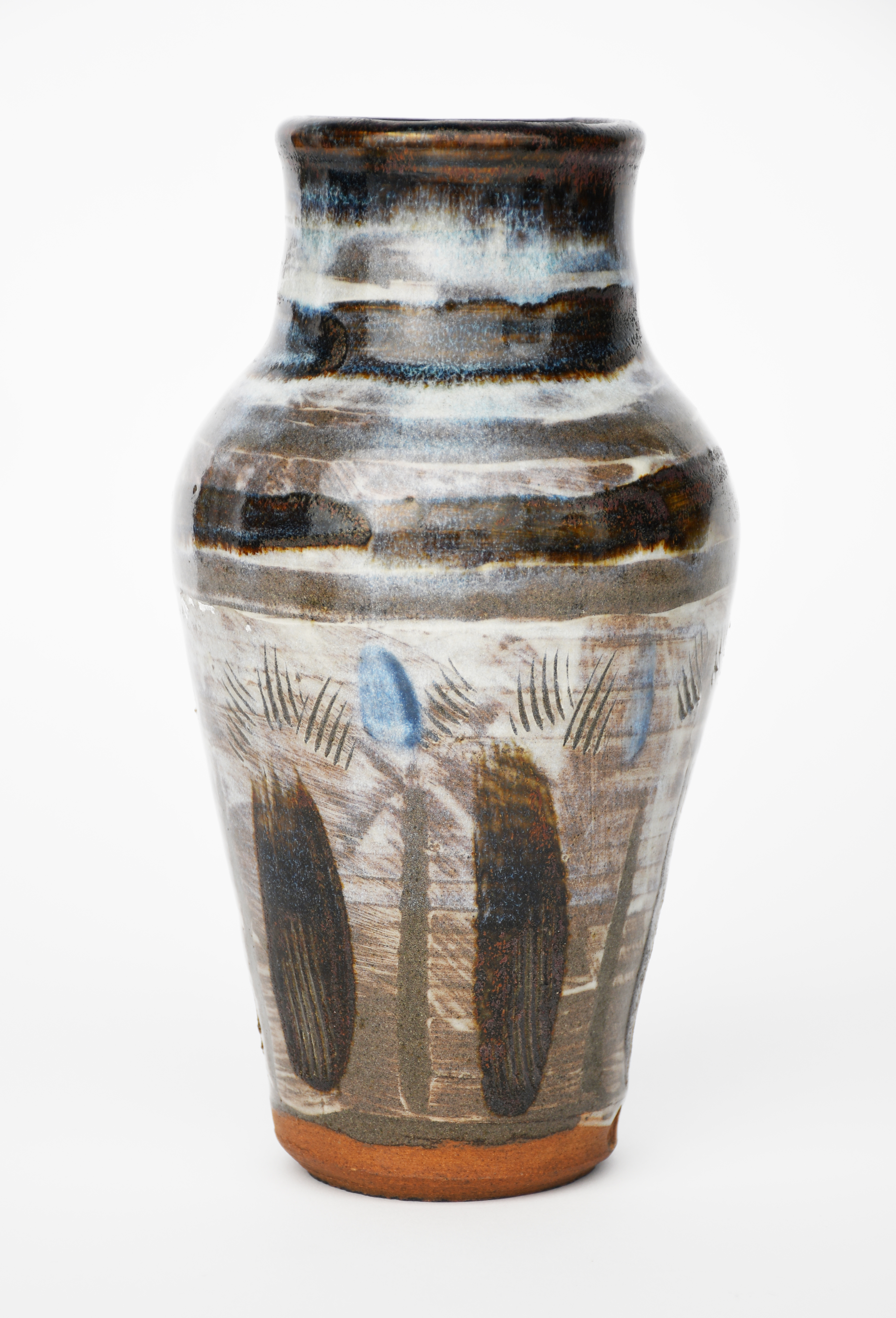 a shouldered stoneware vase, incised and painted with stylised foliate panels, in brown and white slip under a translucent glaze, impressed seal mark, painted FB.5, 25.5cm. high