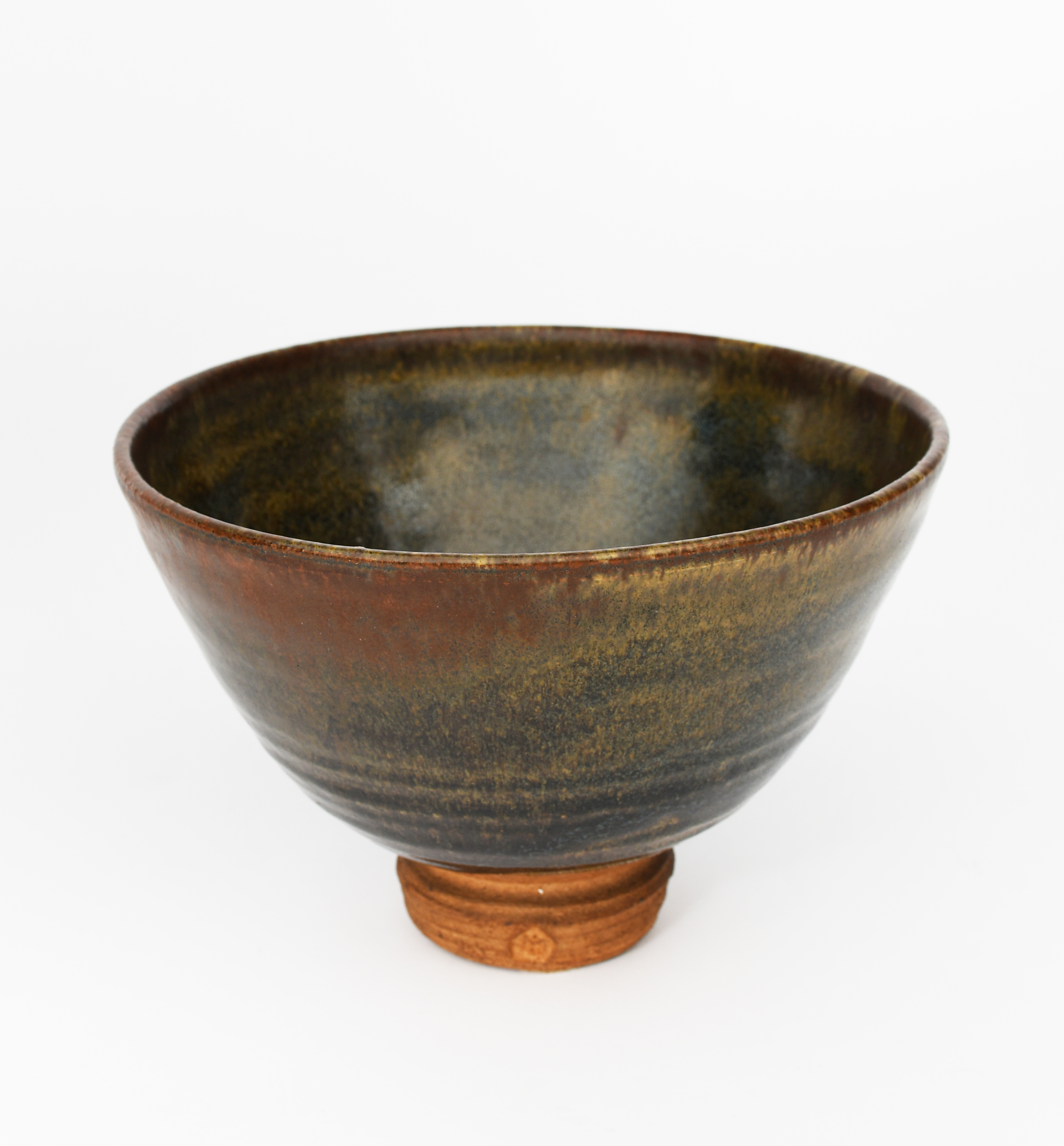a stoneware footed bowl, the flaring conical bowl covered to the foot with a brown hare's fur glaze impressed seal, painted Frich and 19, 20.5cm. diam.