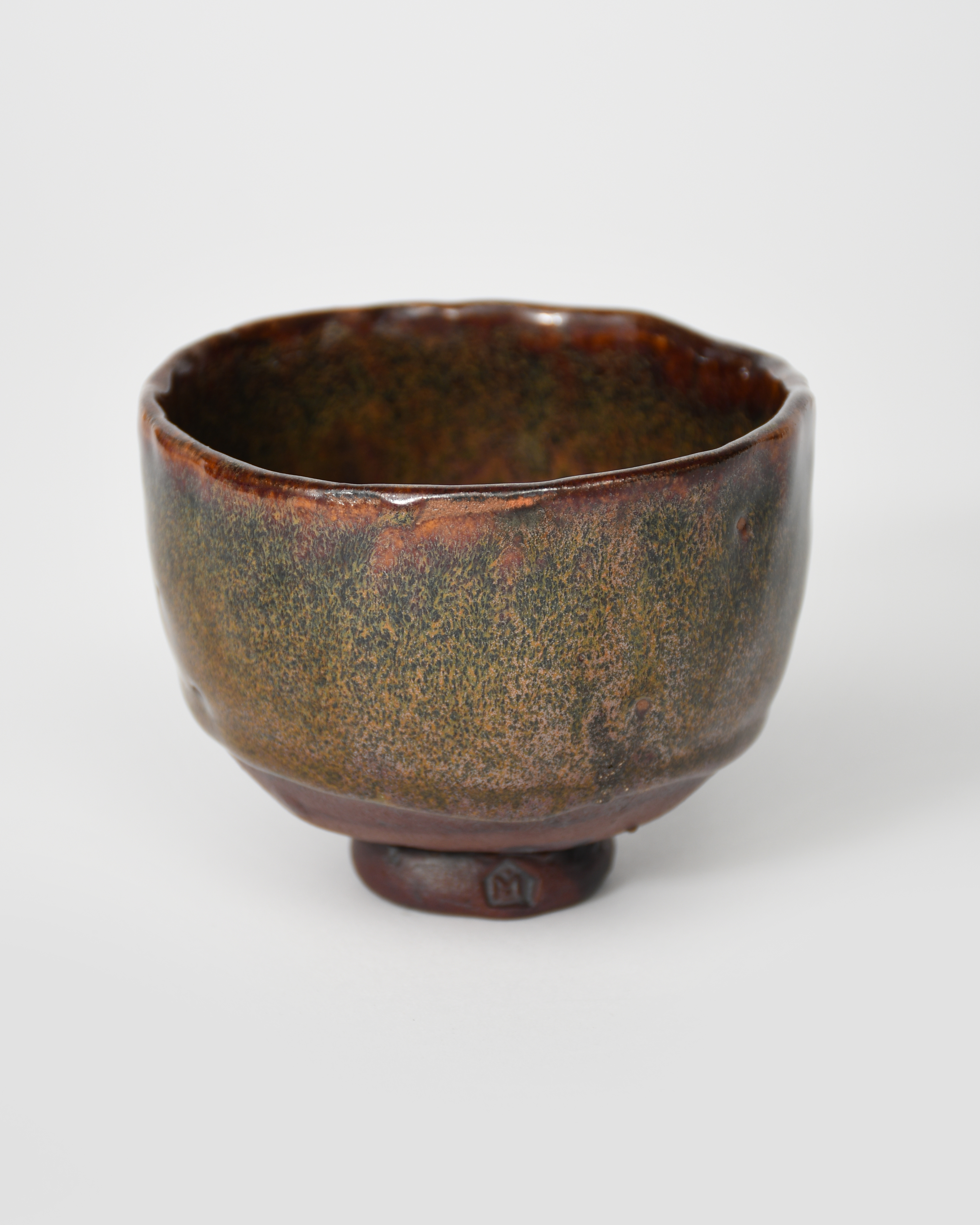 a hand-built stoneware tea bowl on narrow foot, covered to the foot in a rich tenmoku glaze, impressed seal mark to foot, 8cm. high