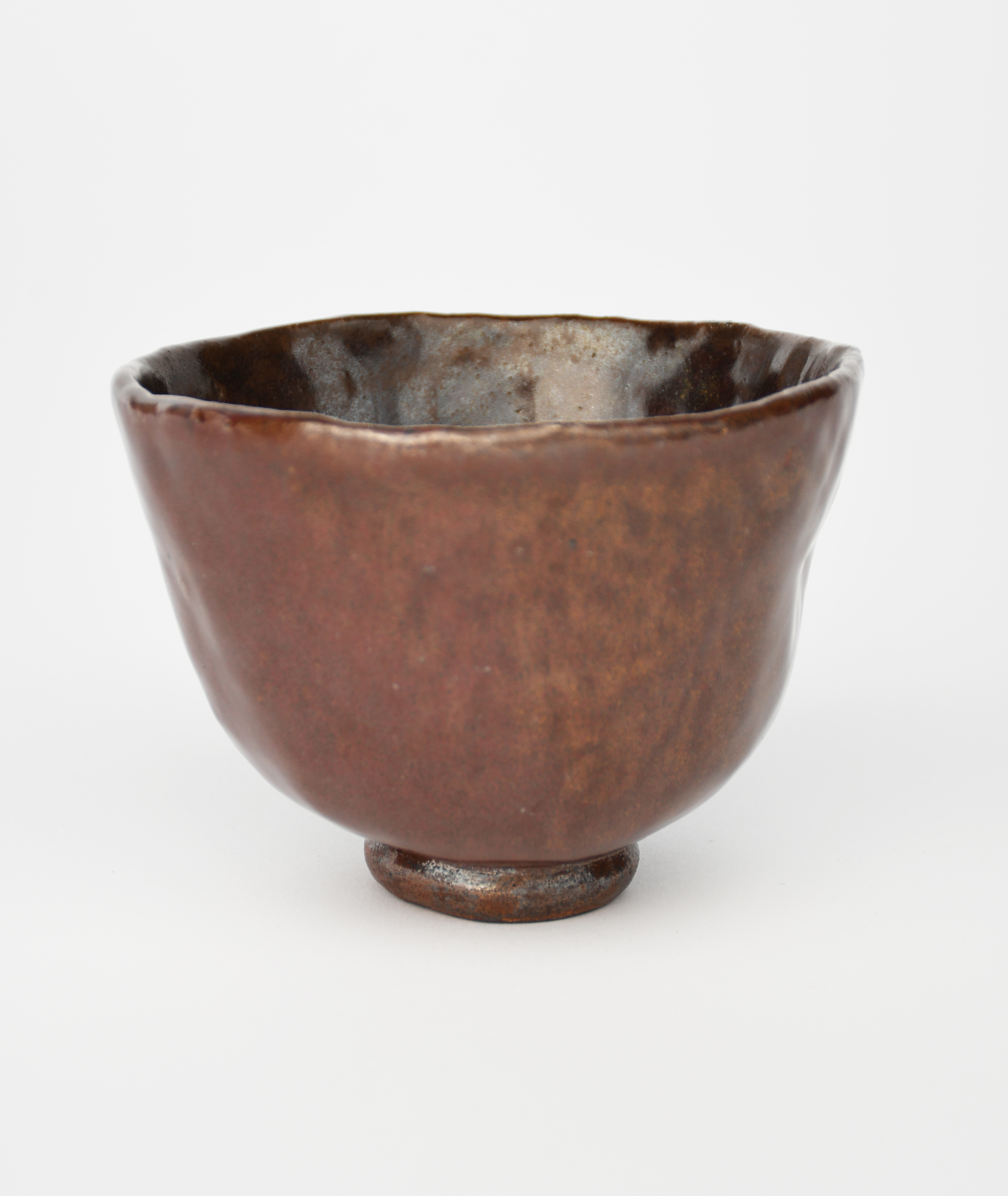 a hand-built stoneware tea bowl, on narrow foot, covered to the foot with a rich chestnut brown glaze, impressed seal mark, 9cm. high,