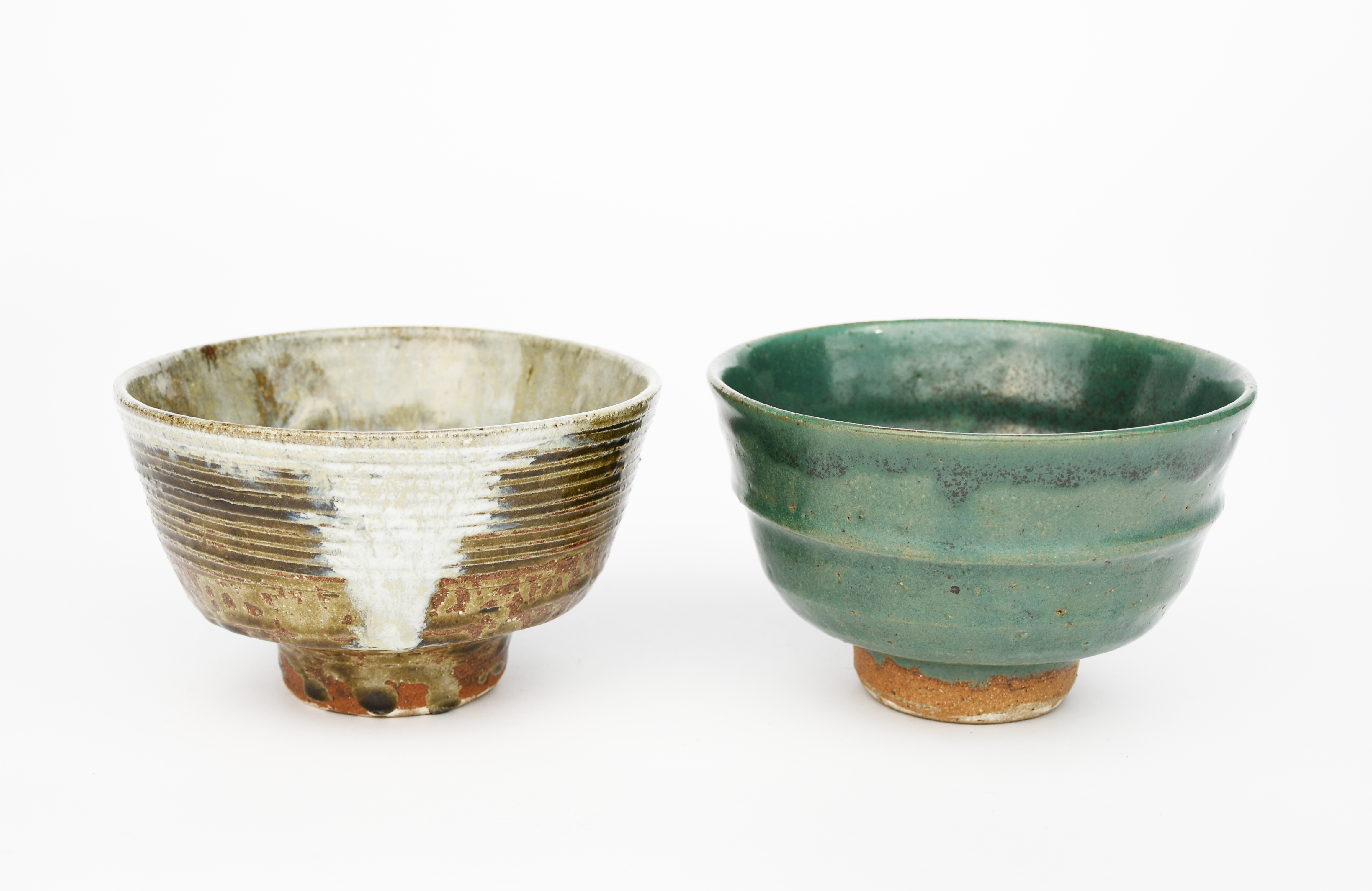 a stoneware footed bowl, covered to the foot in a green glaze, and a stoneware bowl covered with a streaked and translucent ash glaze, impressed seal marks, 15.5cm. diam. (2)