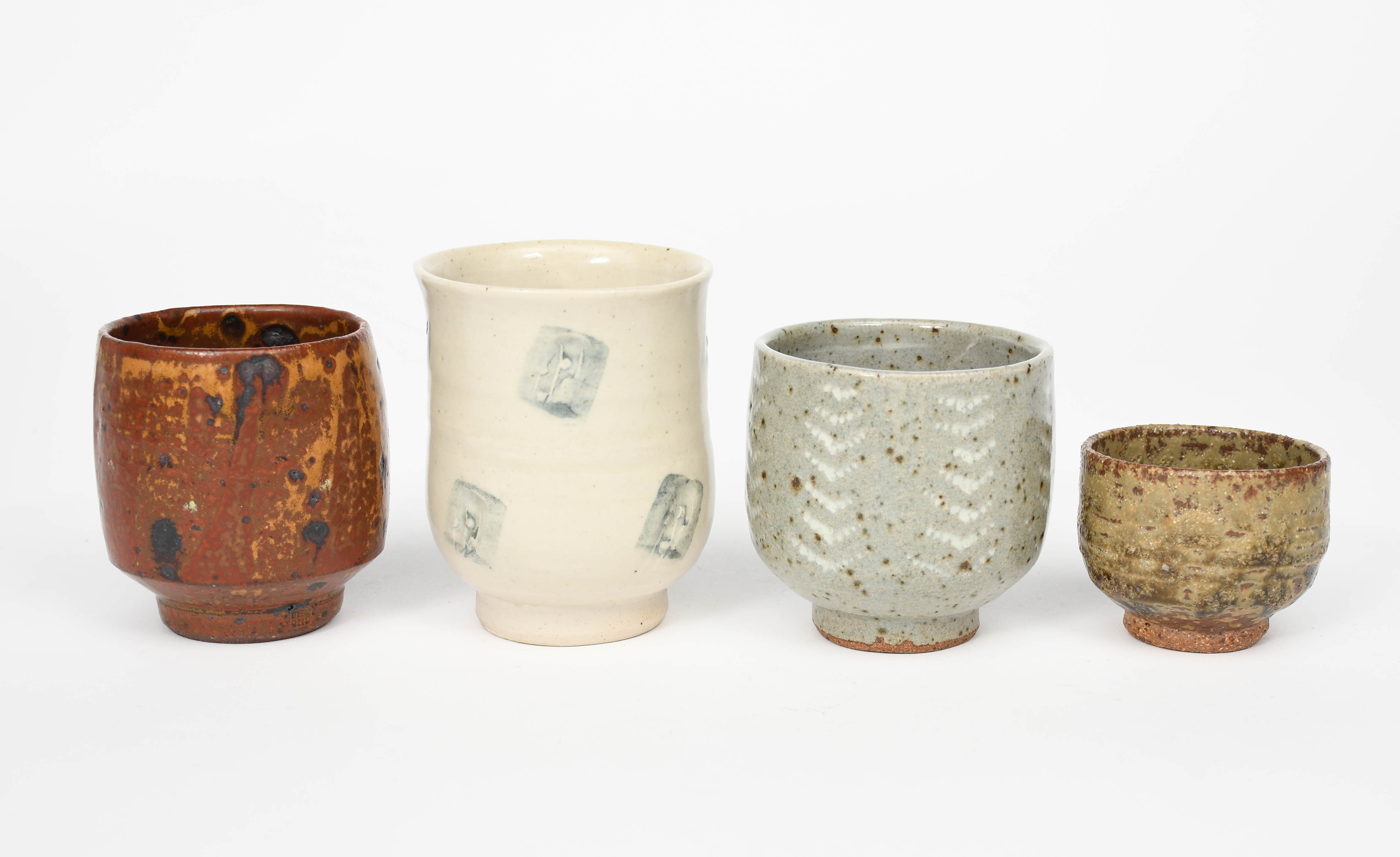 a porcelain unomi, waisted cylindrical form, covered to the foot with a pale grey glaze, impressed repeat decoration under blue glaze, and Henry Hammond stoneware unomi and two others, impressed seal marks, 10cm. high, (4)
