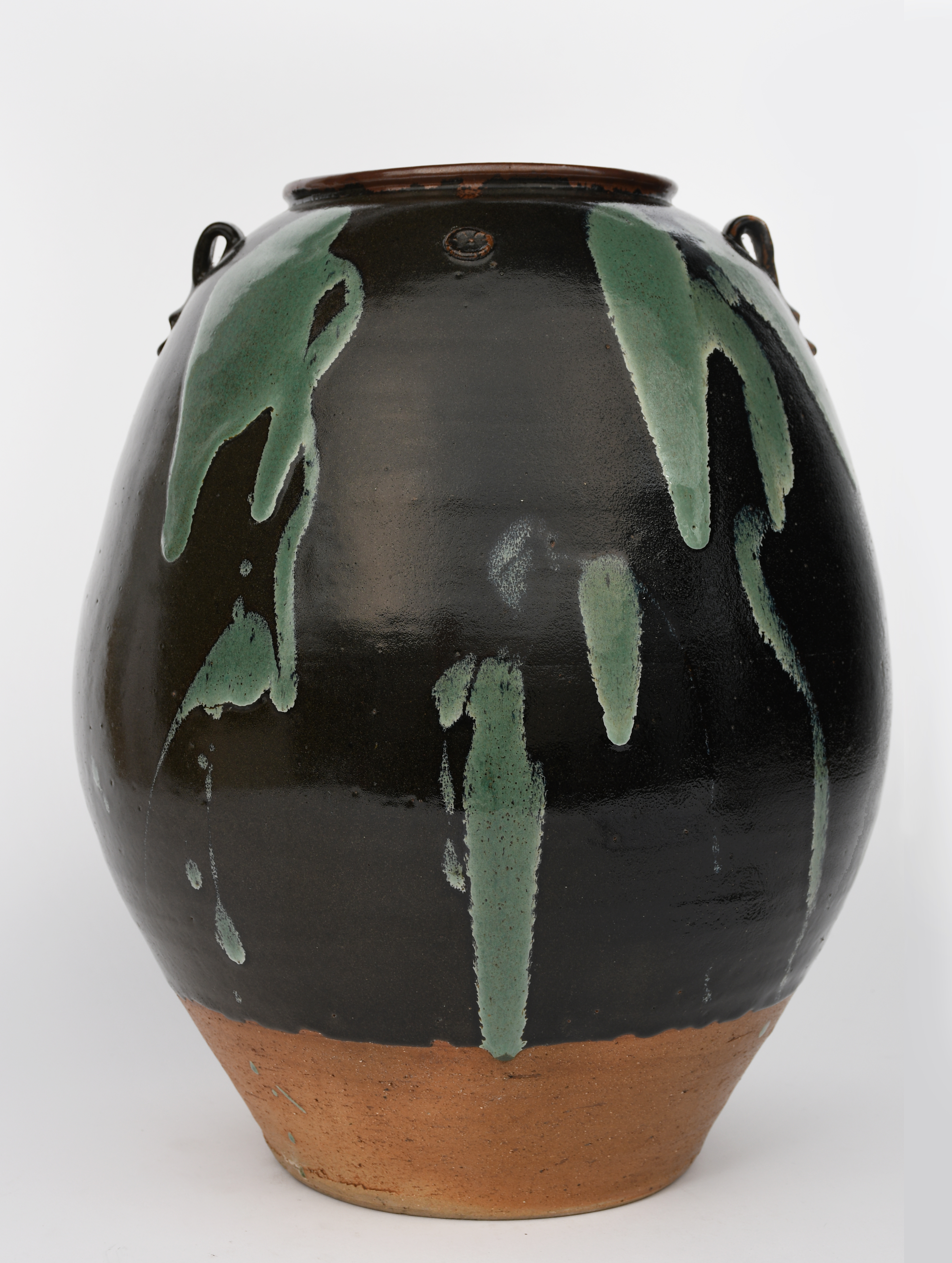 a massive stoneware vase, with applied loop handles and collar rim, covered to the foot with a deep, rich tenmoku glaze and green copper brushed decoration, impressed seal mark, 48cm. high