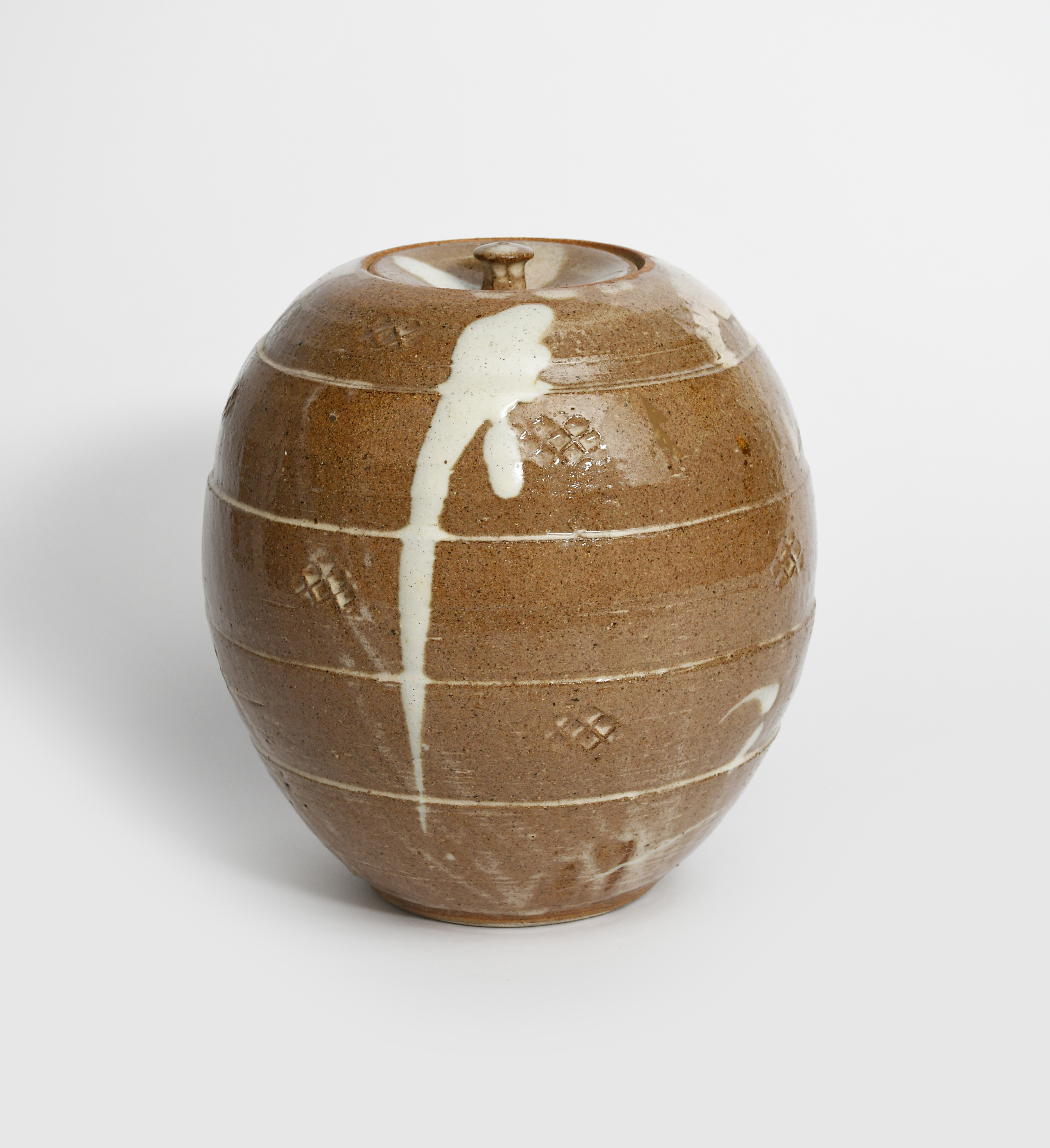 a stoneware vase and cover, ovoid, the shouldered vessel with inset cover, the body with impressed hatched geometric panels, covered in a translucent white glaze, impressed seal mark to base, 27cm. high