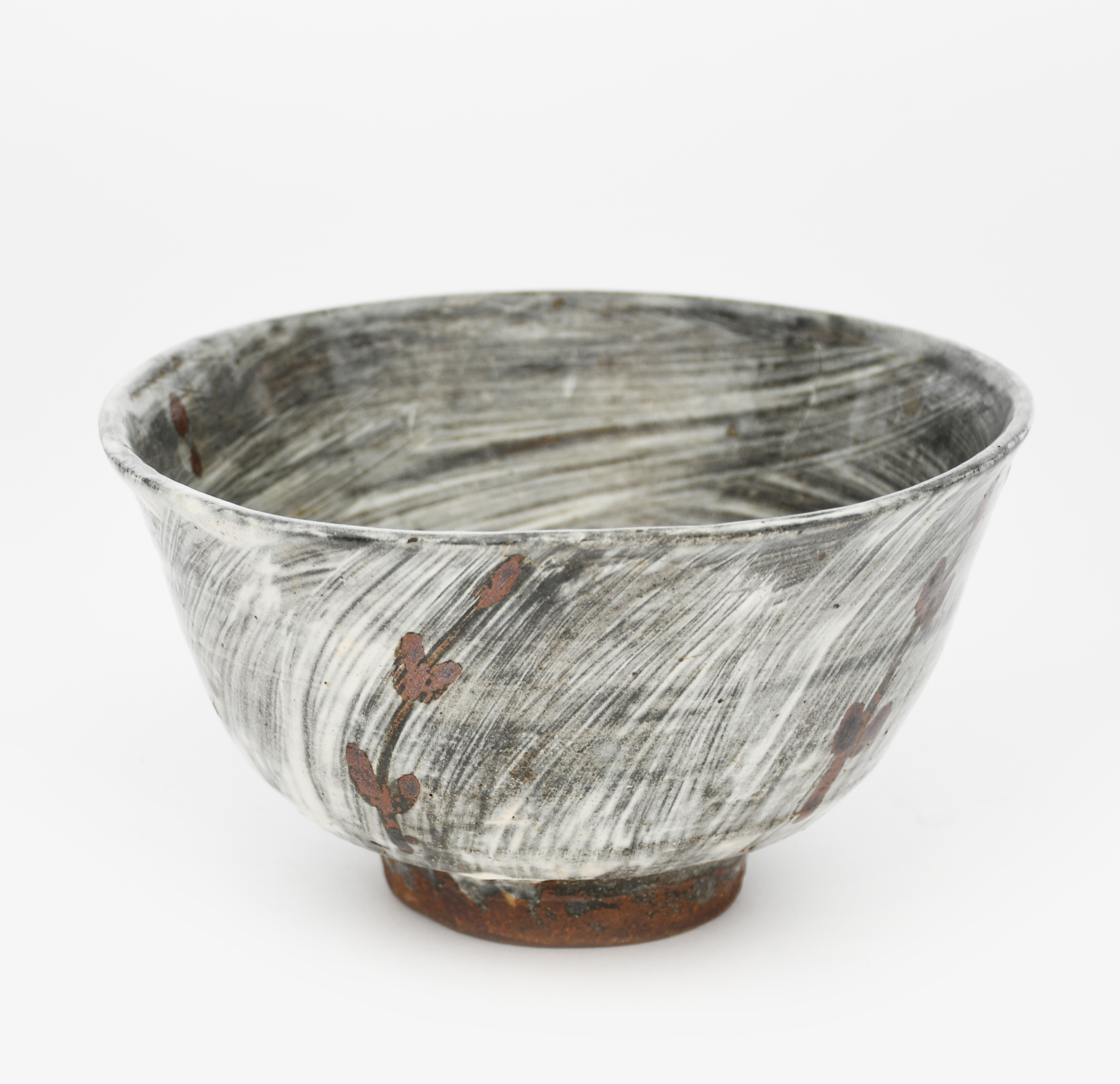 a stoneware footed bowl, brushed grey Hakeme glaze splashed with iron spots to the interior, the exterior with simple painted grasses in iron, impressed seal mark, 17.5cm. diam.