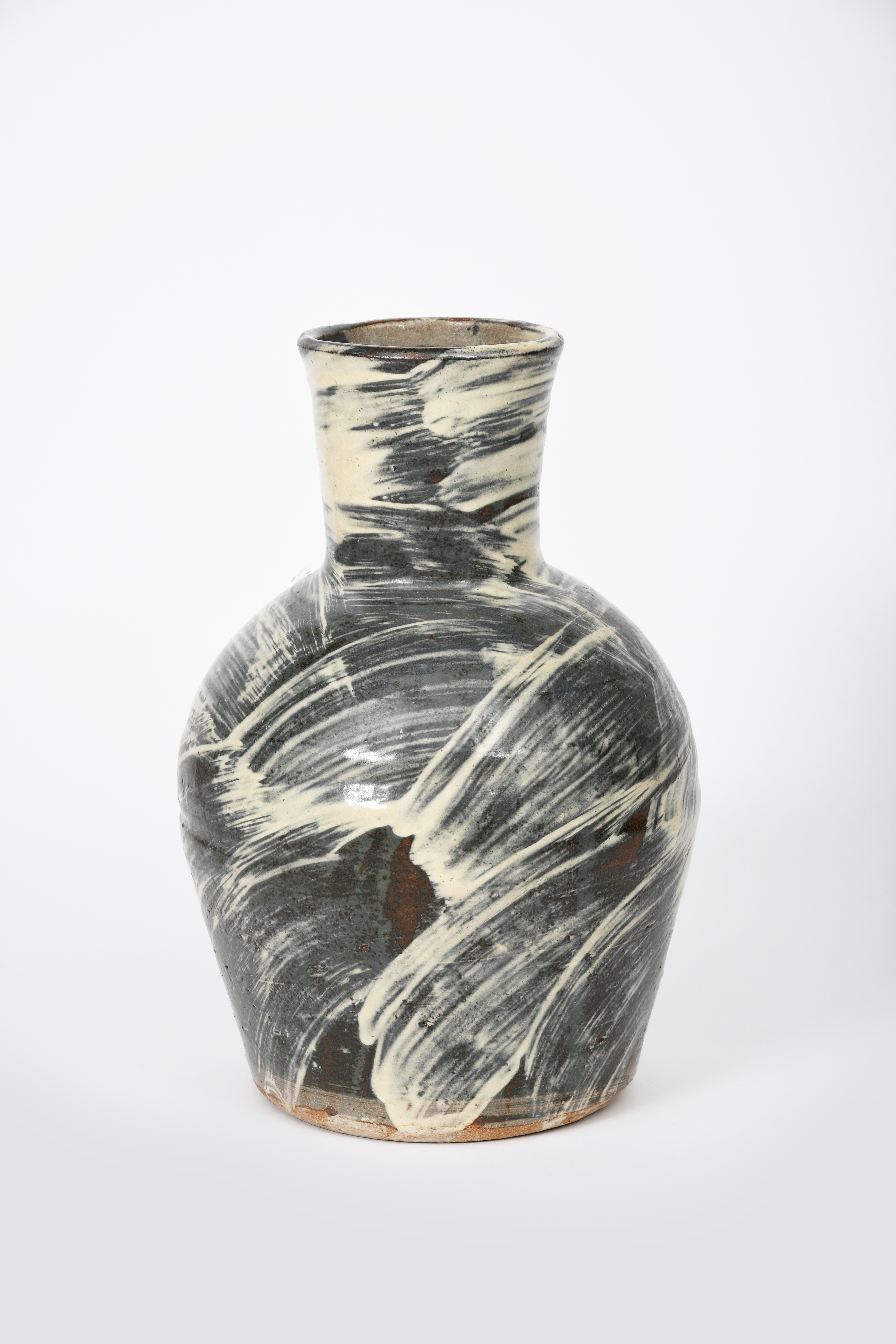 a Leach Pottery stoneware vase, shouldered form with cylindrical neck, dark grey ground with brushed white Hakeme decoration, impressed seal marks, 31.5cm. high