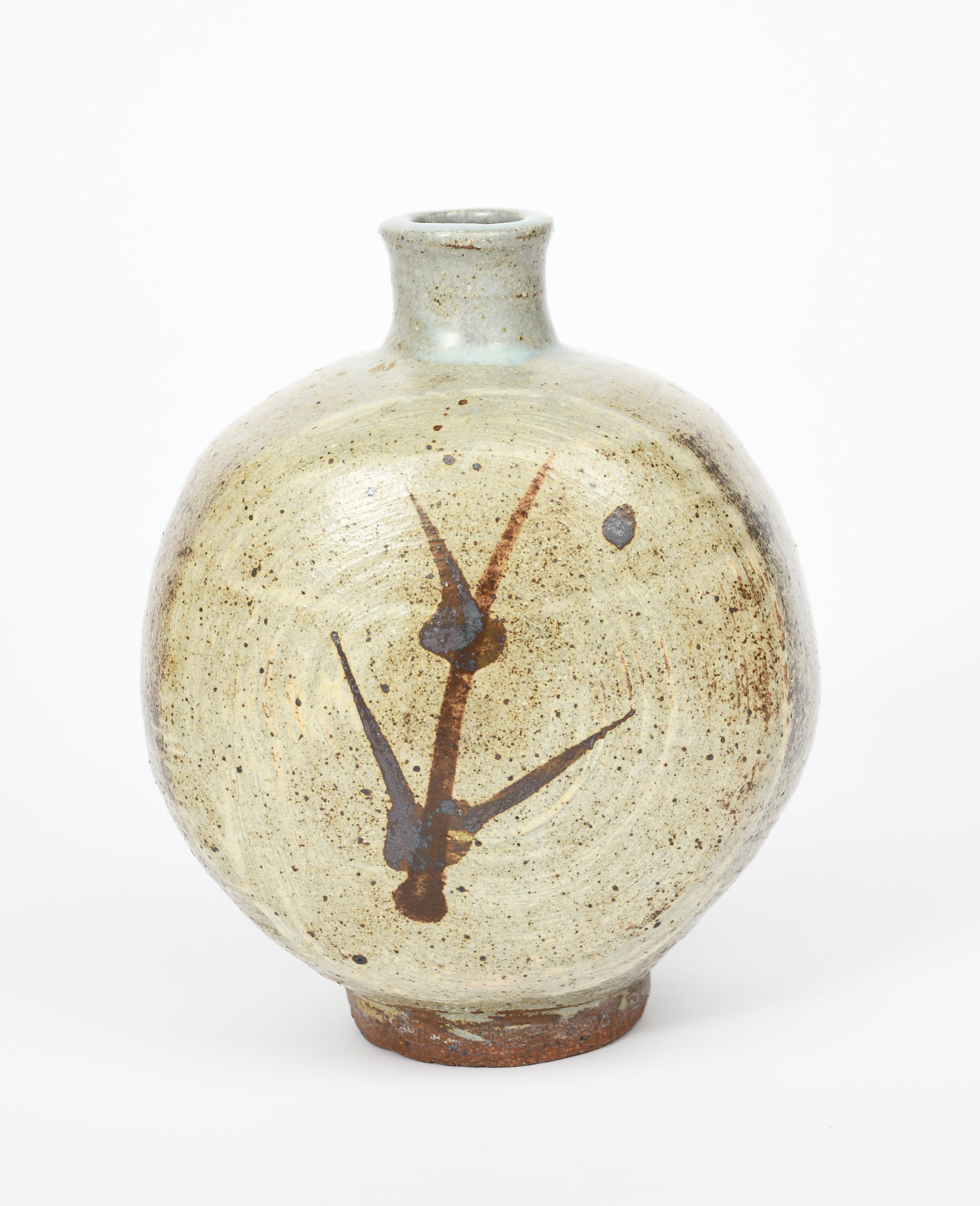 a stoneware vase, pilgrim flask form, covered in a pitted celadon ash glaze to the foot, painted in tenmoku with simple grass motif, indistinct seal marks, 20cm. high