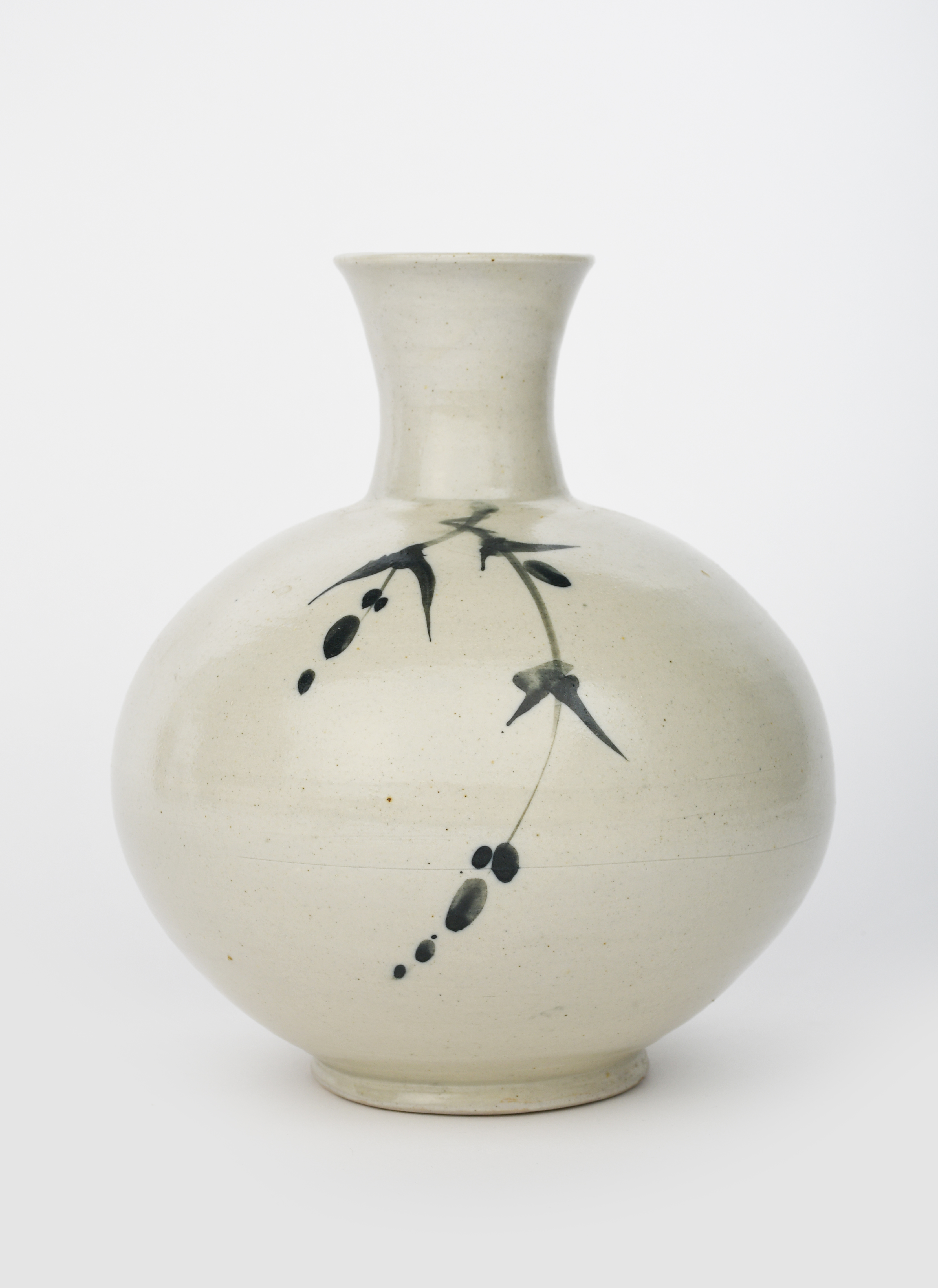a fine porcelain vase dated 2004, ovoid with flaring cylindrical neck, covered in a pale celadon glaze and painted grey bamboo shoot motif, incised monogram and date to base, 25cm. high