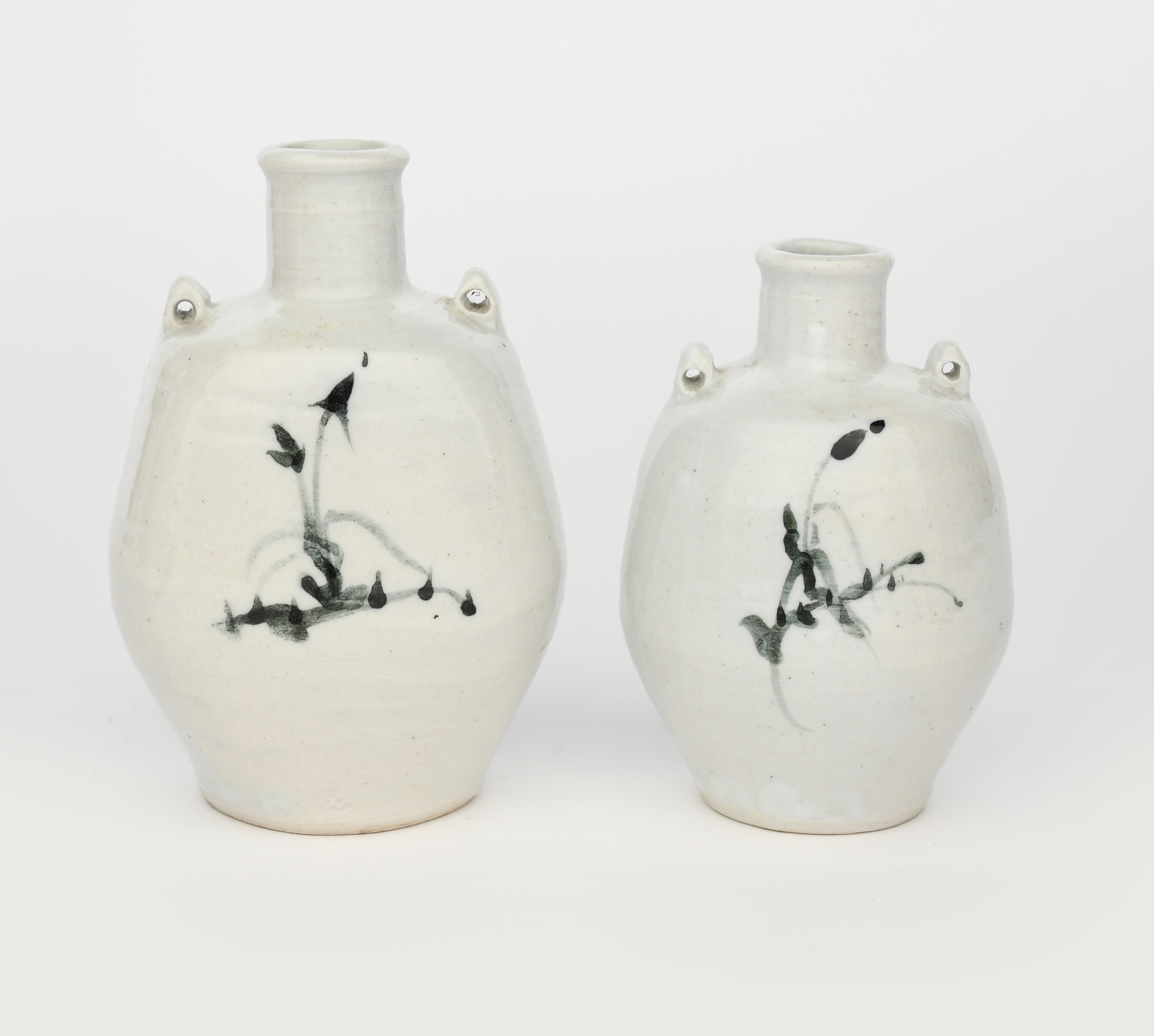 two porcelain vases, shouldered form, each applied with two loop handles, covered in a pale celadon white glaze painted with simple grass motif in black, impressed seal marks, 16cm. high, (2)
