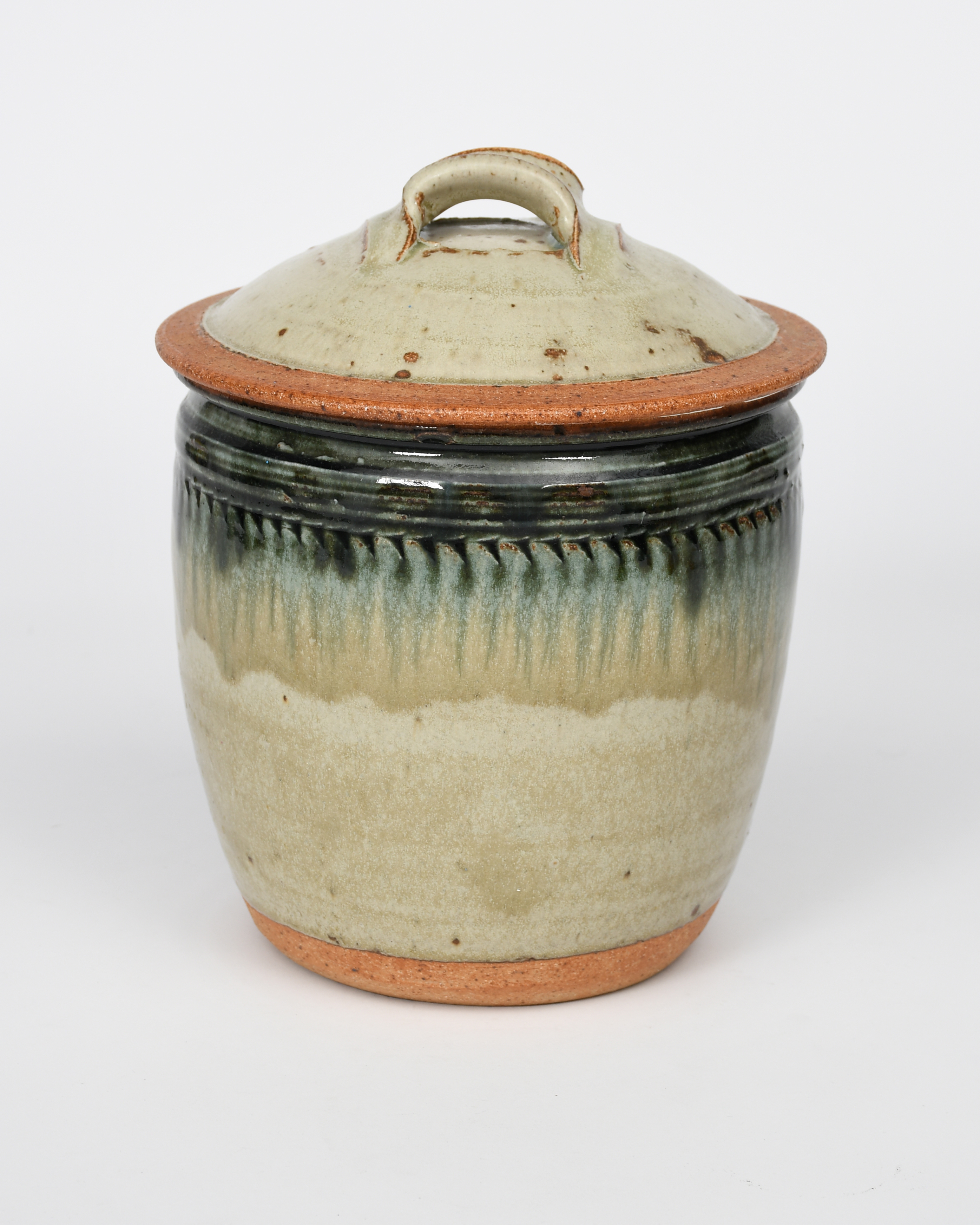 a stoneware jar and cover, swollen cylindrical form with simple incised bands, the shallow domed cover with loop handle, covered to the rims with an ash glaze, unsigned, 25cm. high