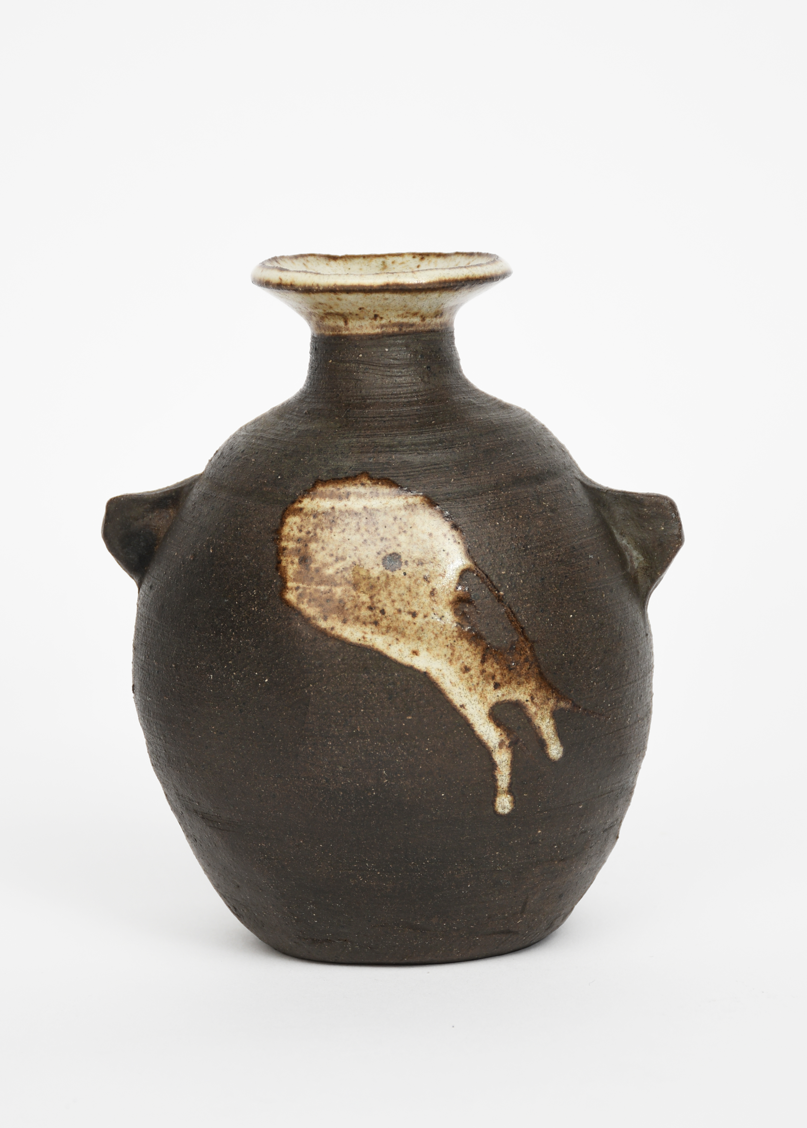 a Leach Pottery stoneware vase with lug handles, matt umber with splashed silver-grey design to body and neck, impressed seal marks, 14.5cm. high