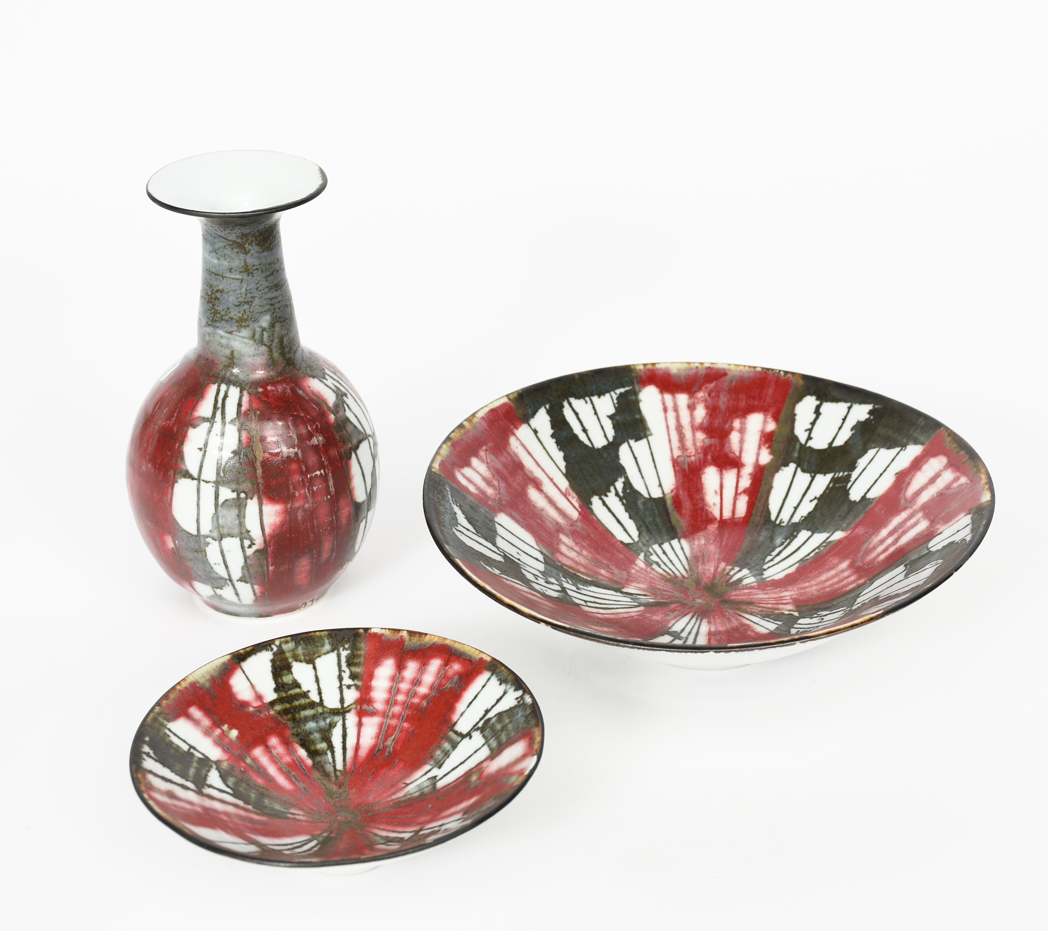 a porcelain solifleur vase, decorated in resist with geometric design in flambe and black on a white ground, and two Marianne De Trey bowls similar, impressed seal mark, 15cm. high (vase), (3)