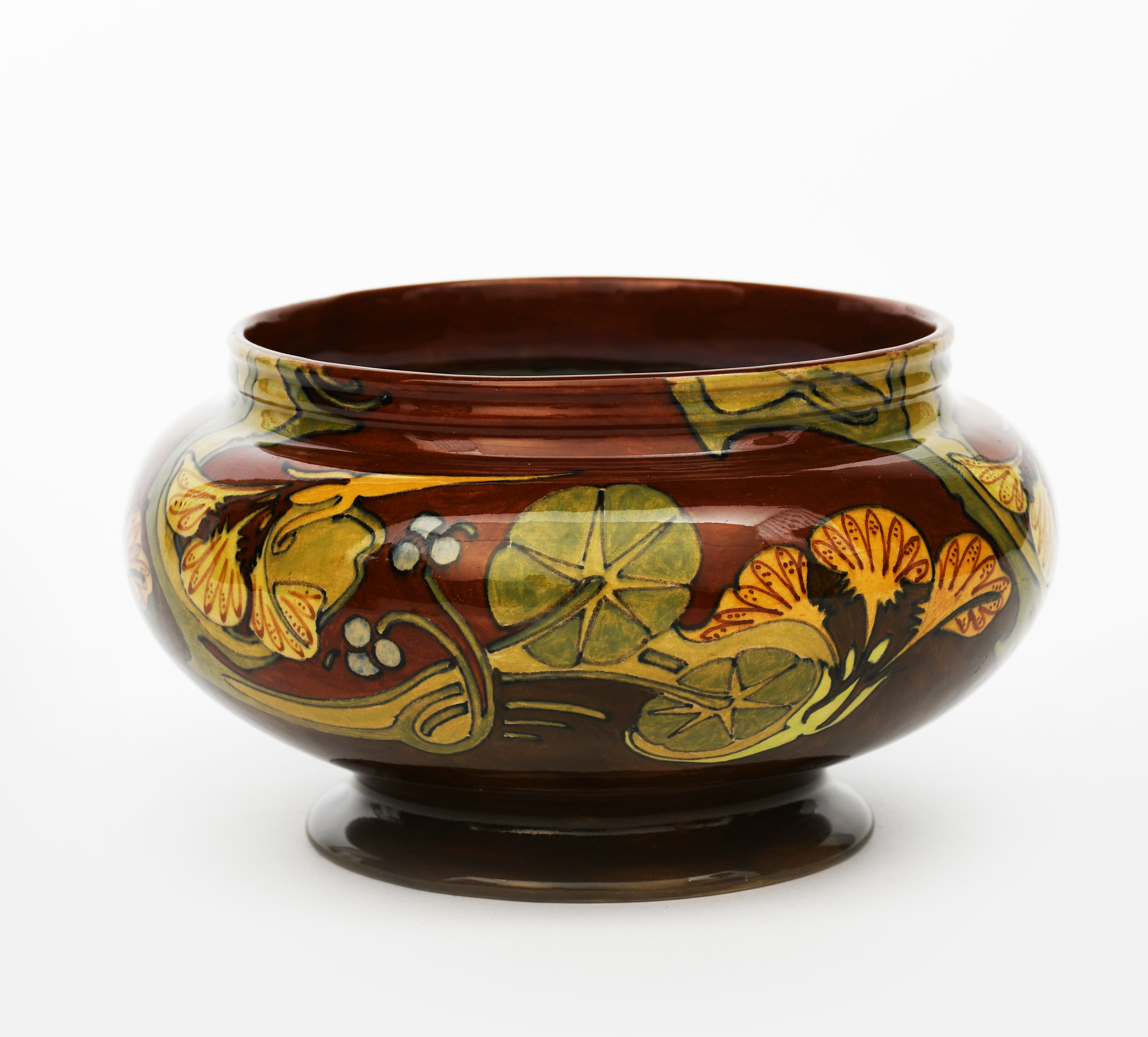 An Art Nouveau Rozenburg Den Haag pottery bowl, painted with a frieze of stylised flowers and foliage in colours on a brown ground, painted marks, and bee date mark for 1900, 18cm. diam.