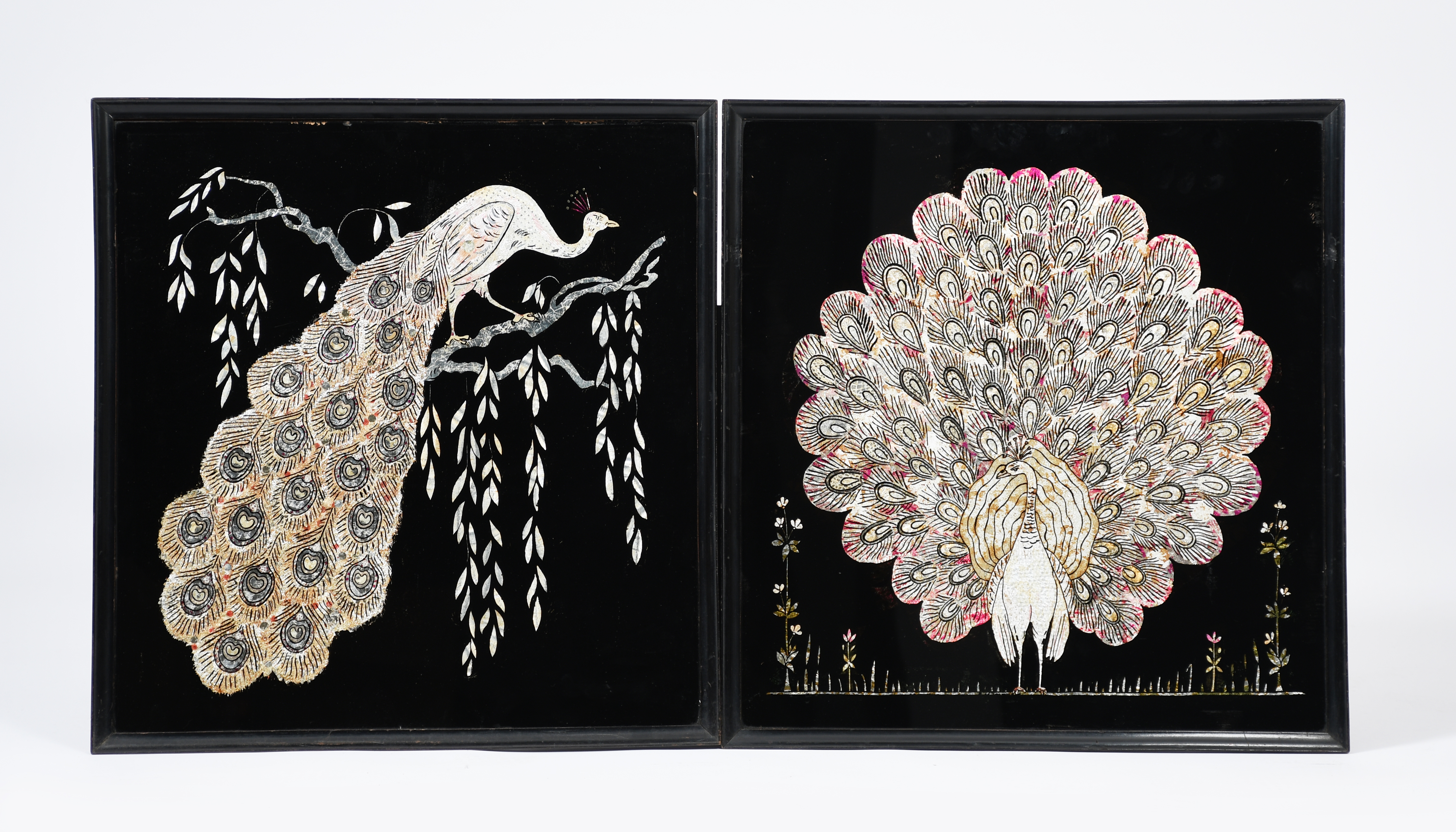 A pair of painted foil Peacock panels, each square form, one peacock modelled displaying, the other perched in a tree bough, on black ground, unsigned, 54 x 52cm. (2)