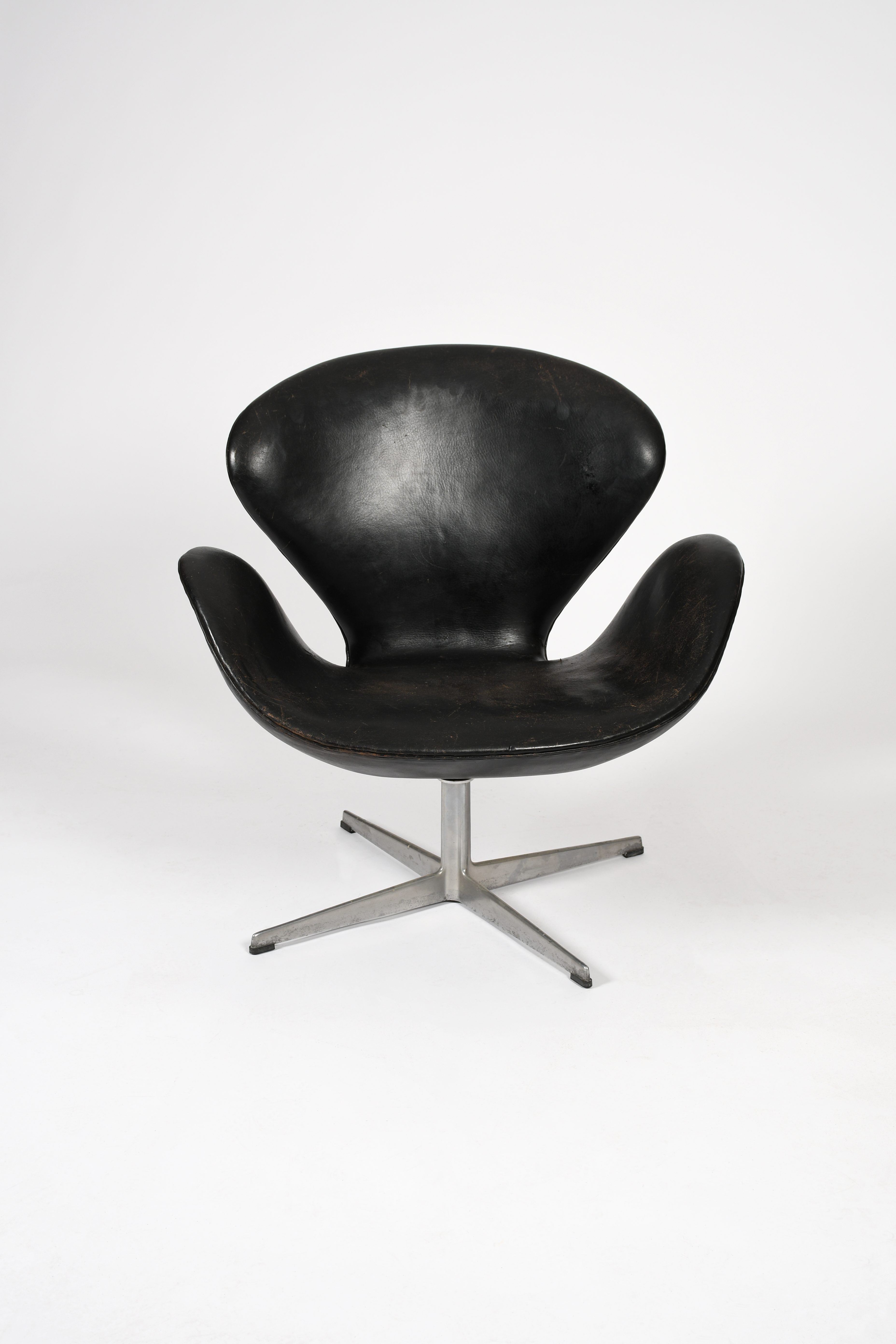 A Fritz Hansen Swan chair designed by Arne Jacobsen, originally designed for the SAS Royal Hotel, Copenhagen, 1958, black leather padded seat and back on aluminium cruciform base, applied label, 76cm. high