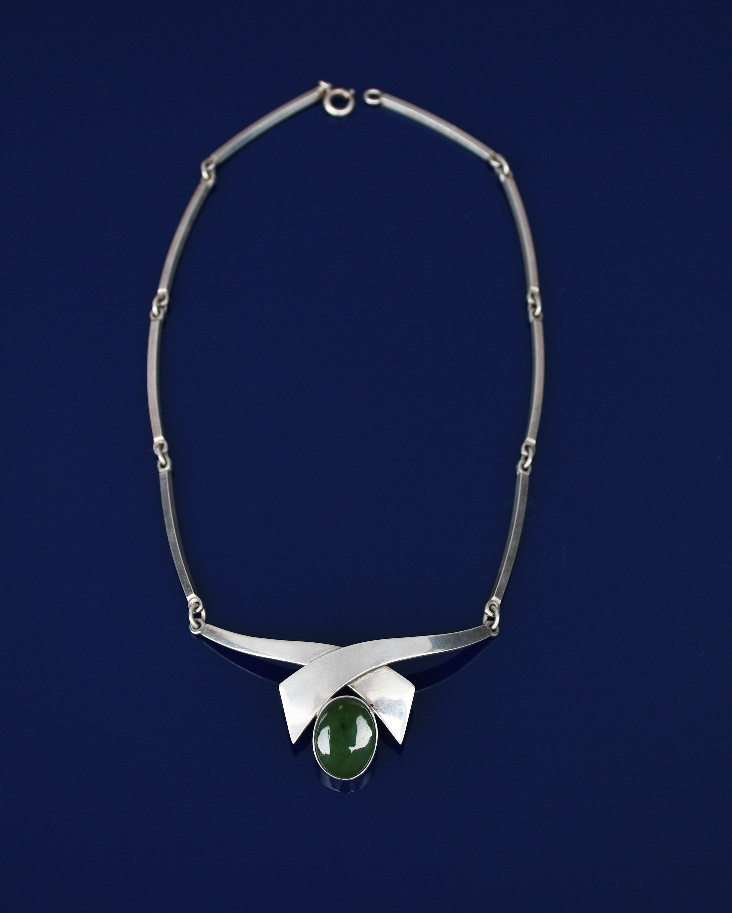 A Niels Erik silver and green chrysoprase necklace, two silver ribbons supporting green chrysoprase elliptical panel, on eight link chain, stamped marks, 6cm. wide (pendant)